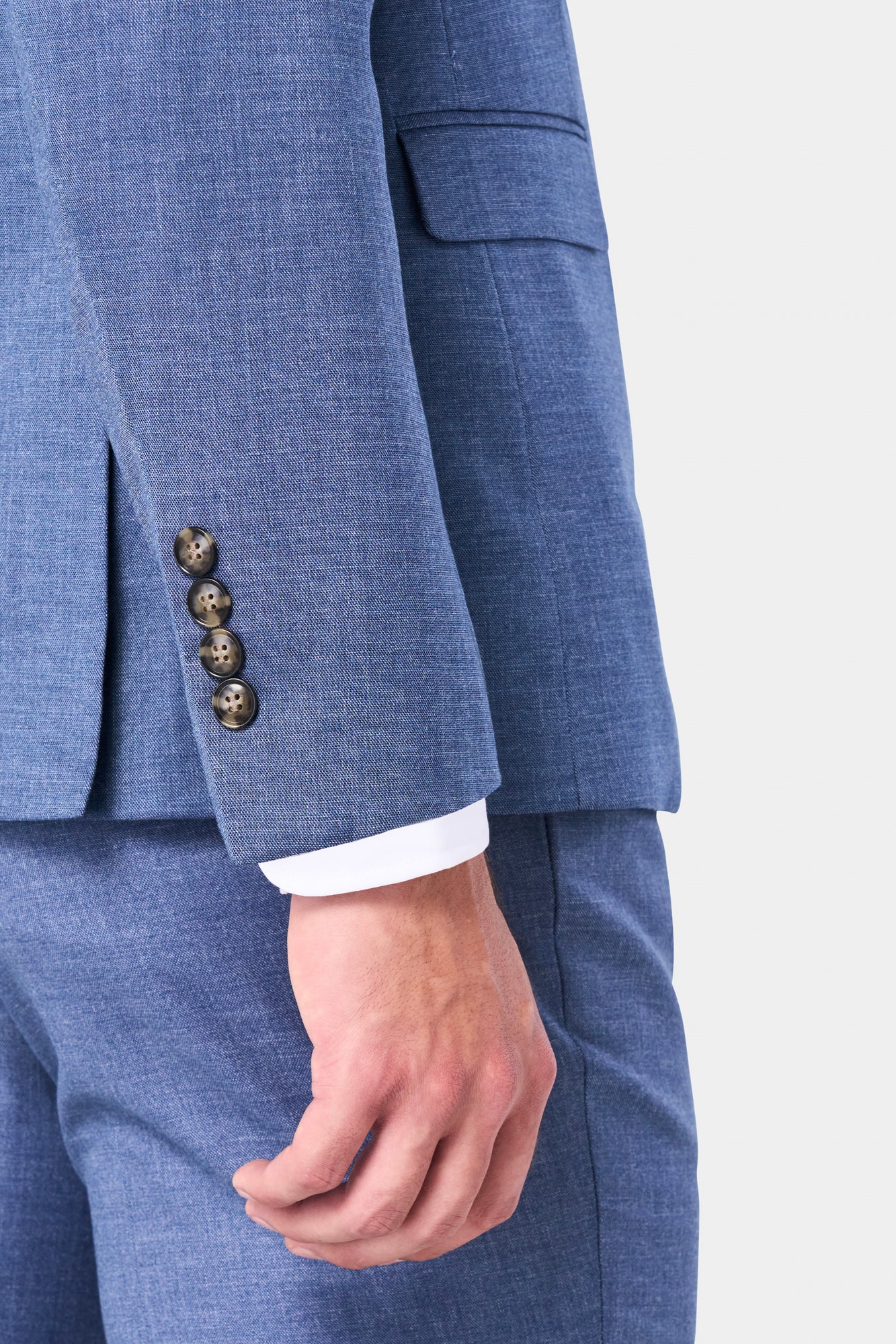 This suit is made from a lightweight sharkskin textured fabric in a rich blue hue, which is versatile and eye-catching. Also, the material has a fine texture with a subtle pattern. Sharkskin is a versatile fabric that drapes nicely while maintaining structure. It is cool in warm weather yet substantial enough for cooler climates. The wool blend also resists wrinkles and stains, making the suit easy to maintain and wear.