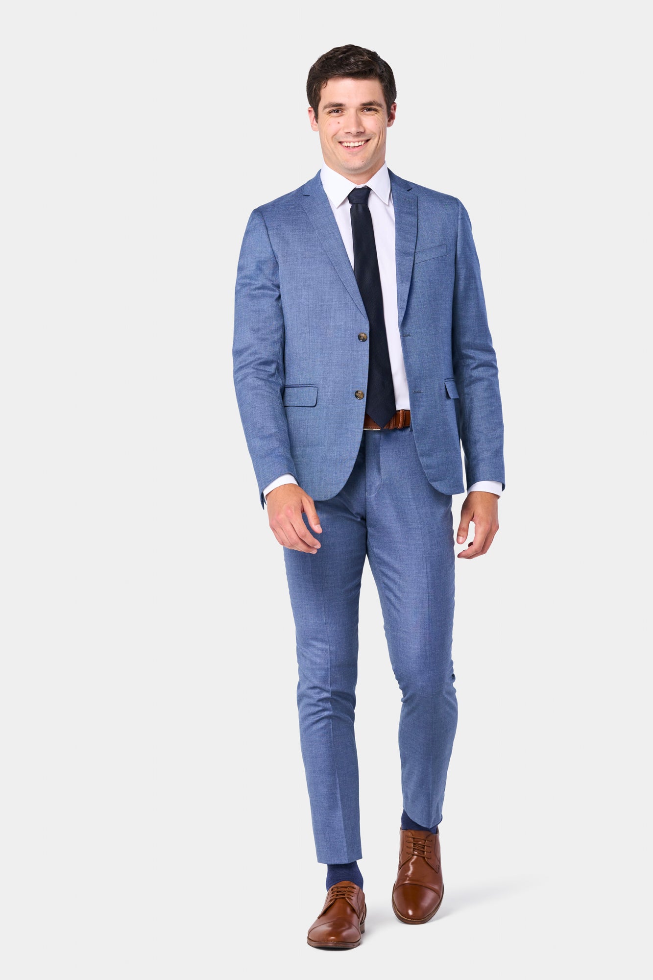 This refined suit can be worn year-round for a variety of settings. Pair it with a crisp white dress shirt, silk tie, and oxford shoes for the office. For formal occasions, don a French cuff dress shirt, polished brown shoes, and cufflinks. The slim fit flatters most body types. The stunning blue color makes a confident statement that will help you stand out anytime you wear the suit.