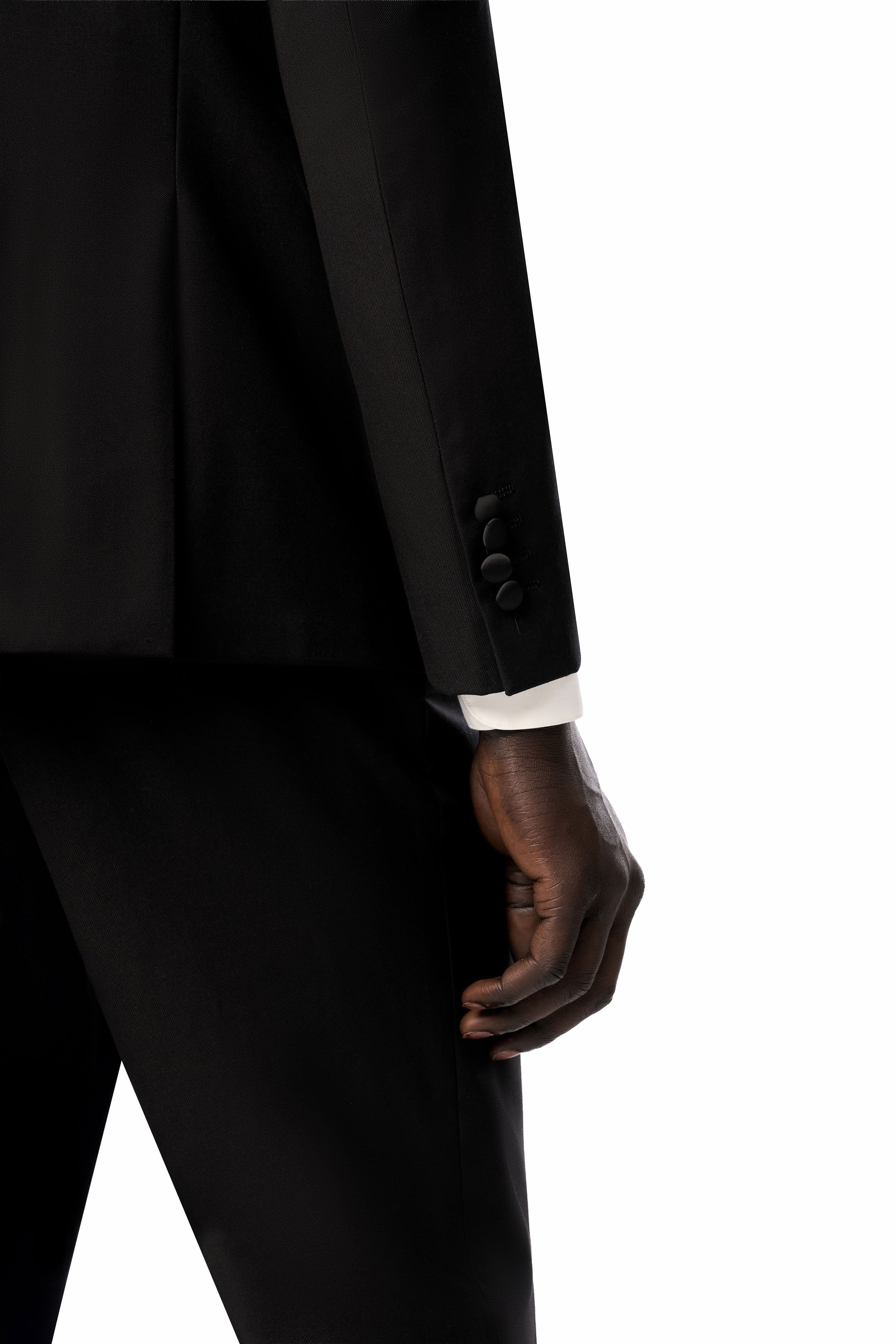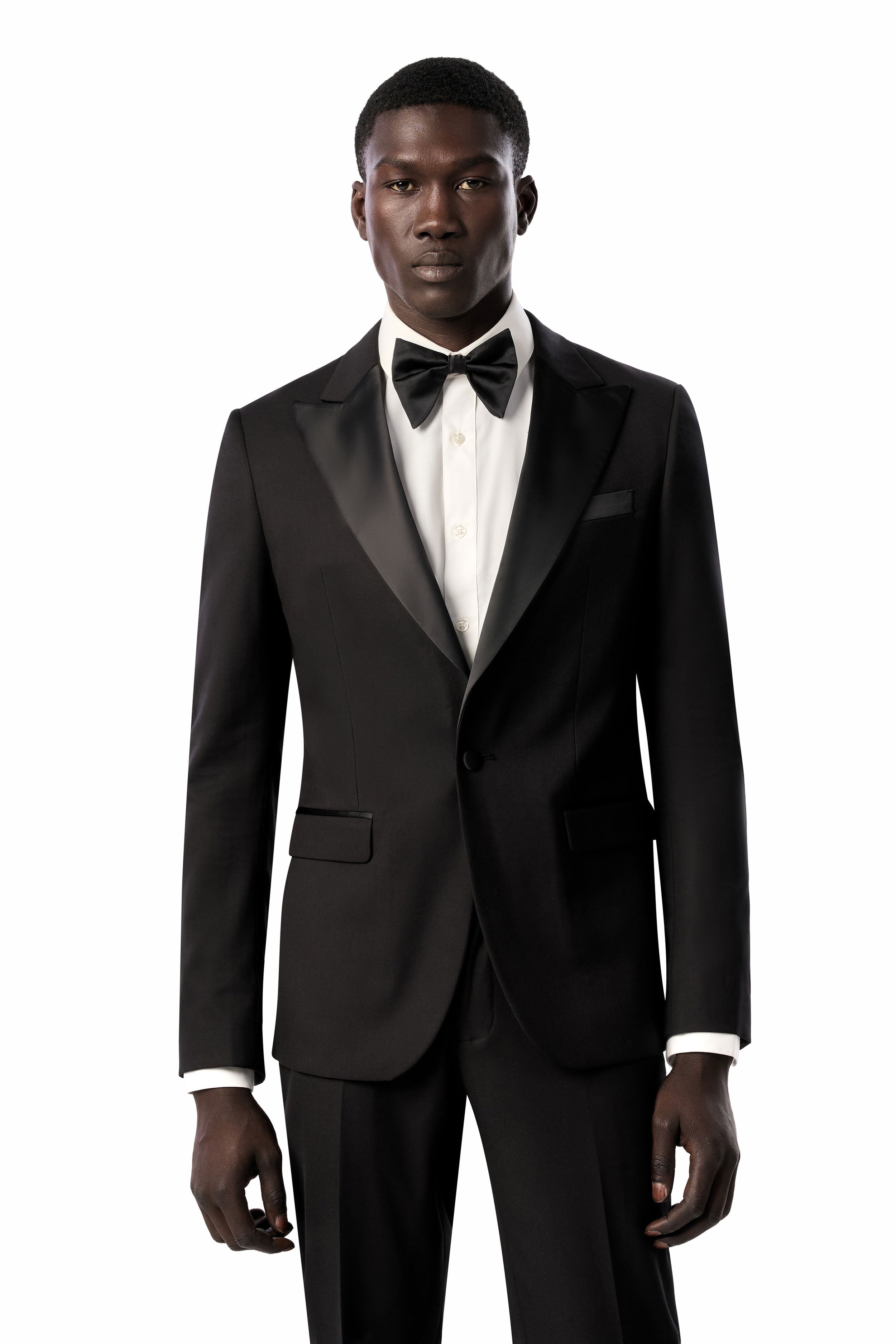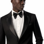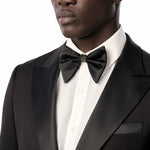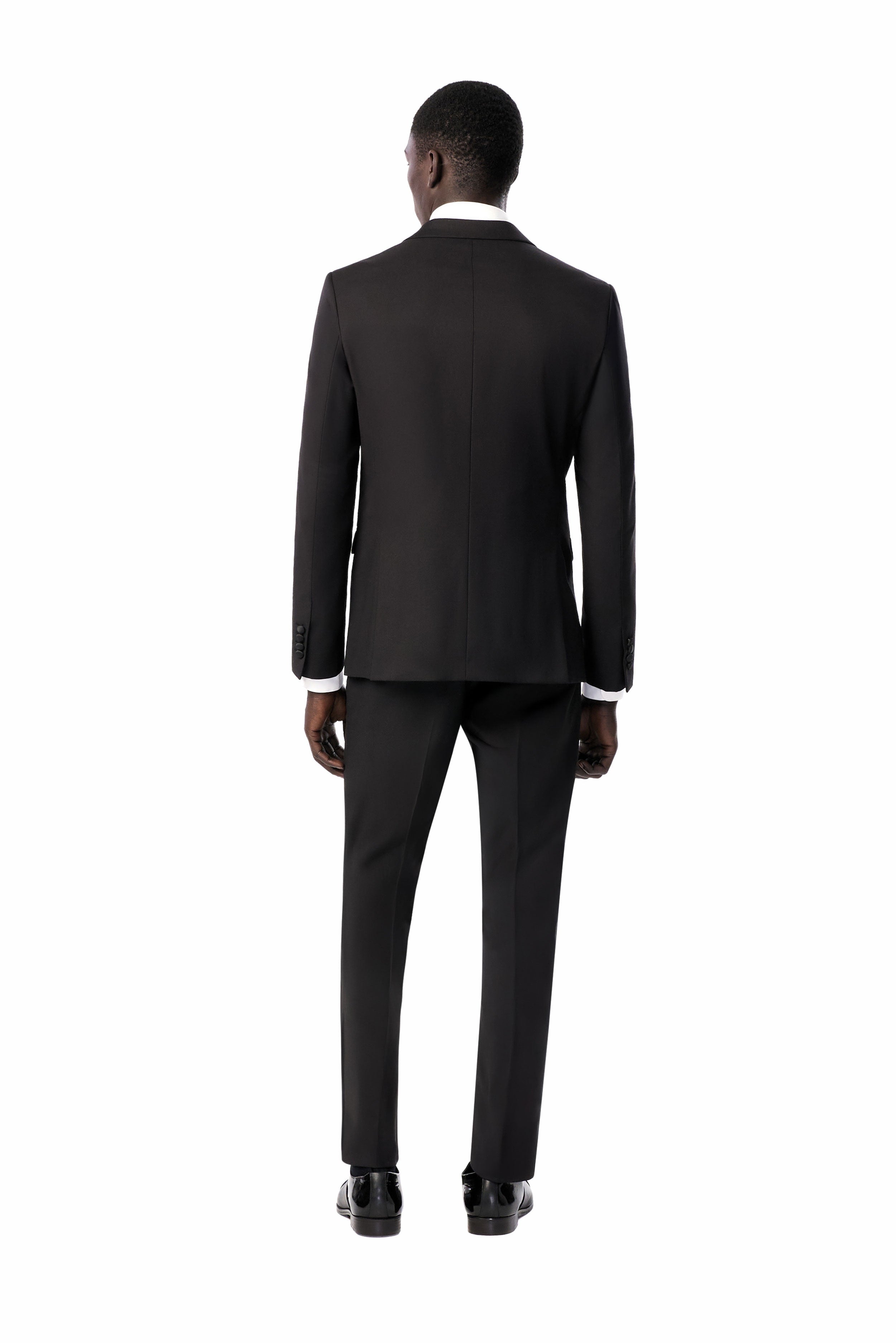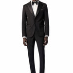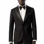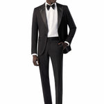 This timeless black tuxedo provides a refined foundation to craft a variety of elegantly stylish looks. For traditional flair, pair it with a white tux shirt, black bow tie, and patent leather shoes. For a creative edge, complement it with a bold shirt, metallic accents, and bit loafers. Regardless of how you style it, this classic black tuxedo has you looking confidently dapper.