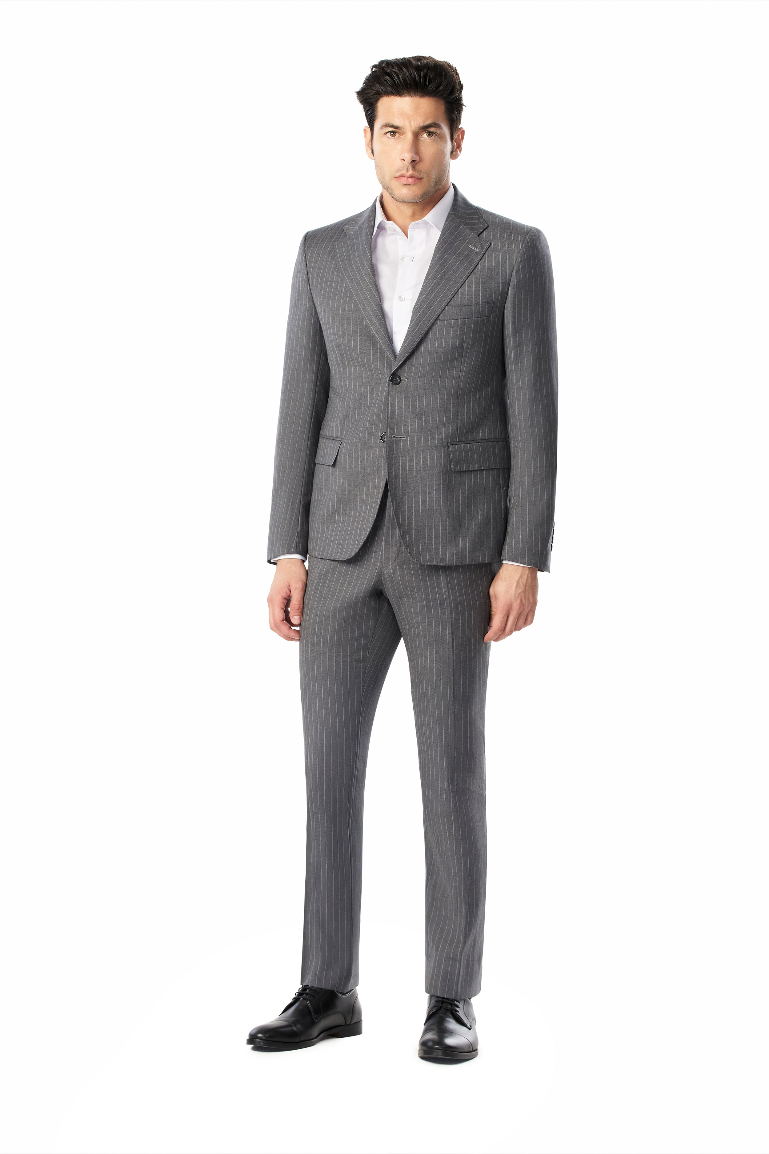 With its refined gray pinstripe design, 100% Italian wool construction, 1/2 canvas lining, and masterful Italian craftsmanship, this suit from The Heritage Collection is the epitome of timeless elegance. The two-button jacket, notch lapel, and slim fit create a commanding yet approachable silhouette. For the modern gentleman seeking to make a sophisticated statement, this Classic Gray Pinstripe suit is an impeccable choice.