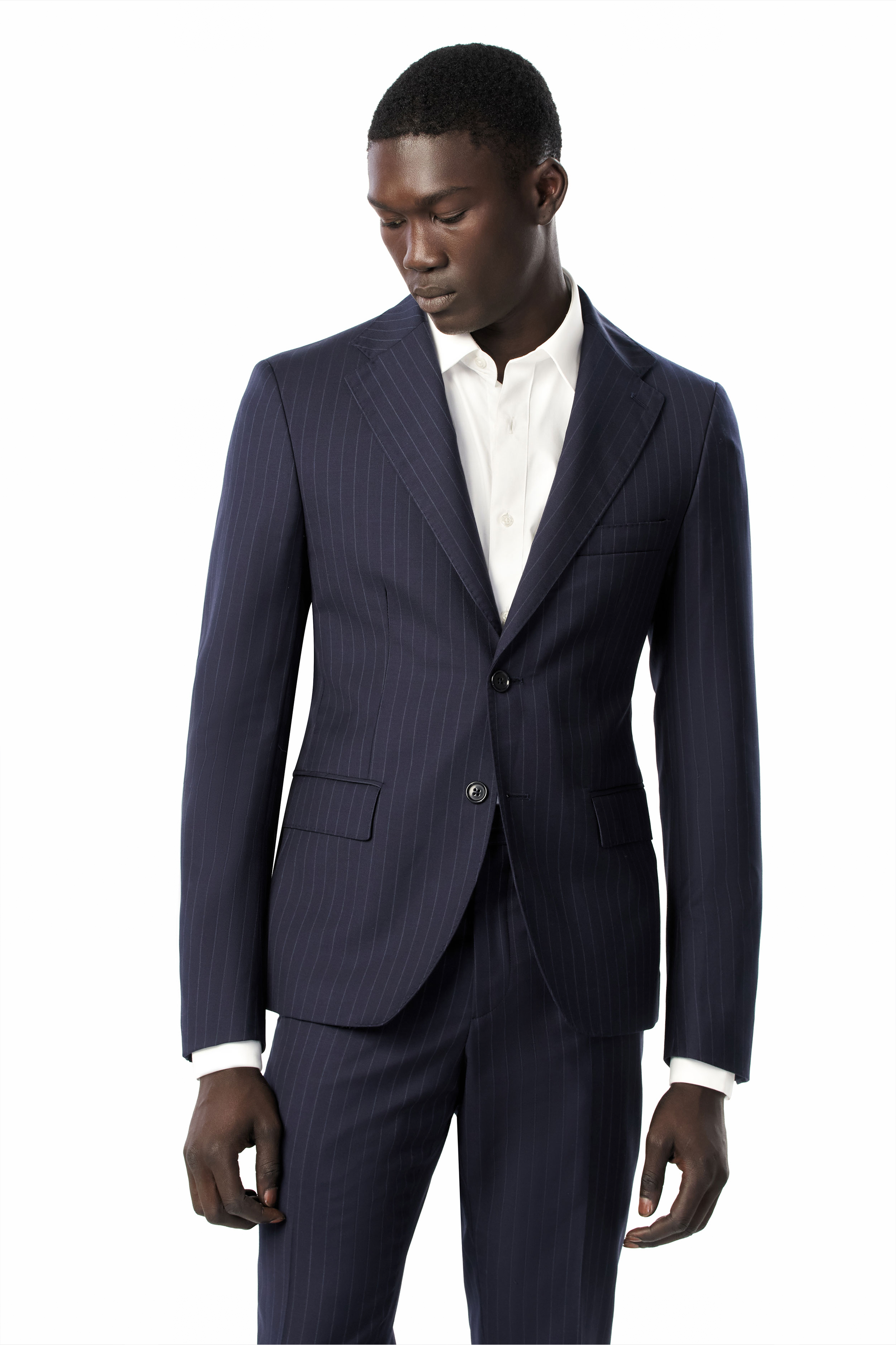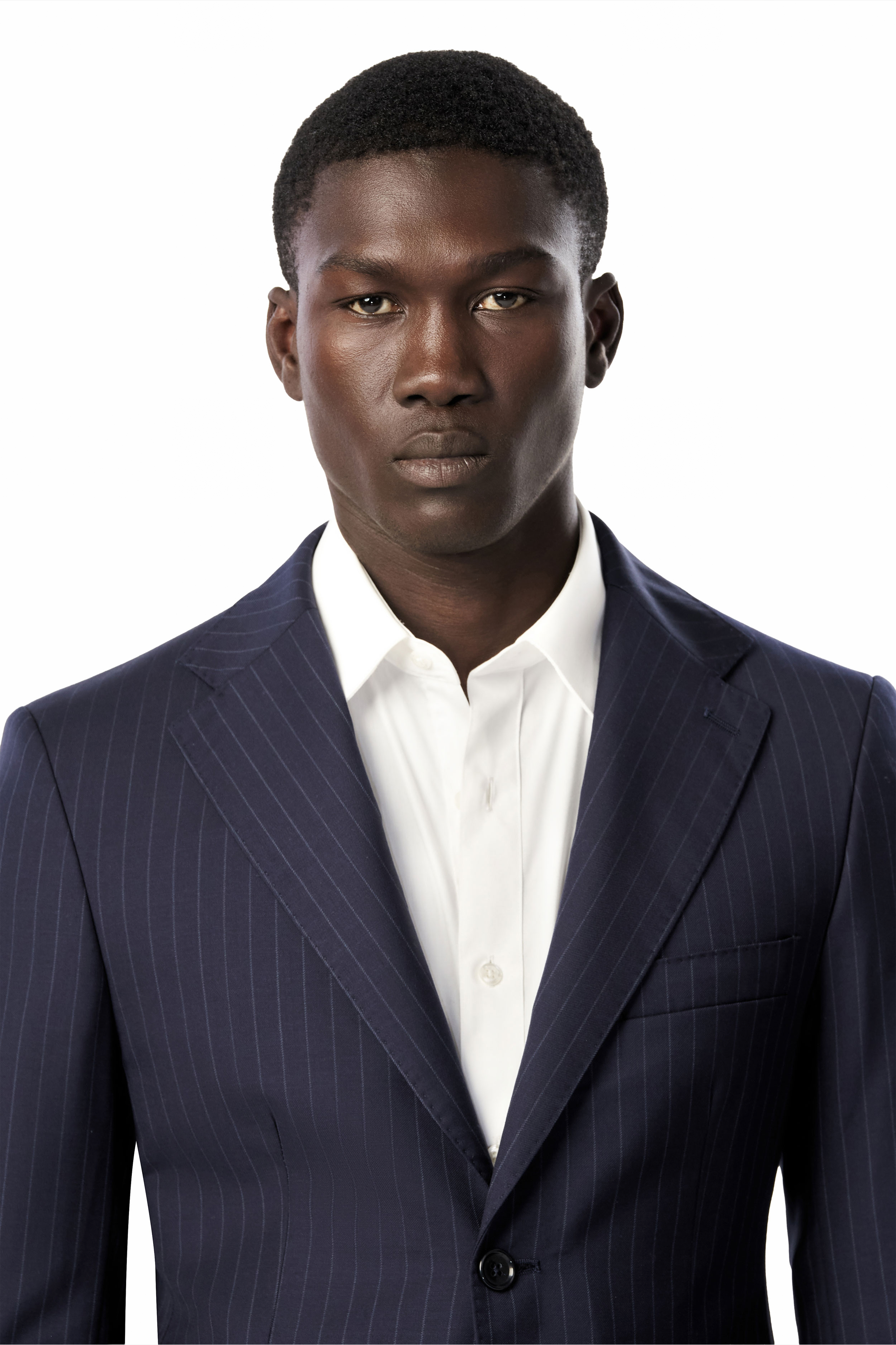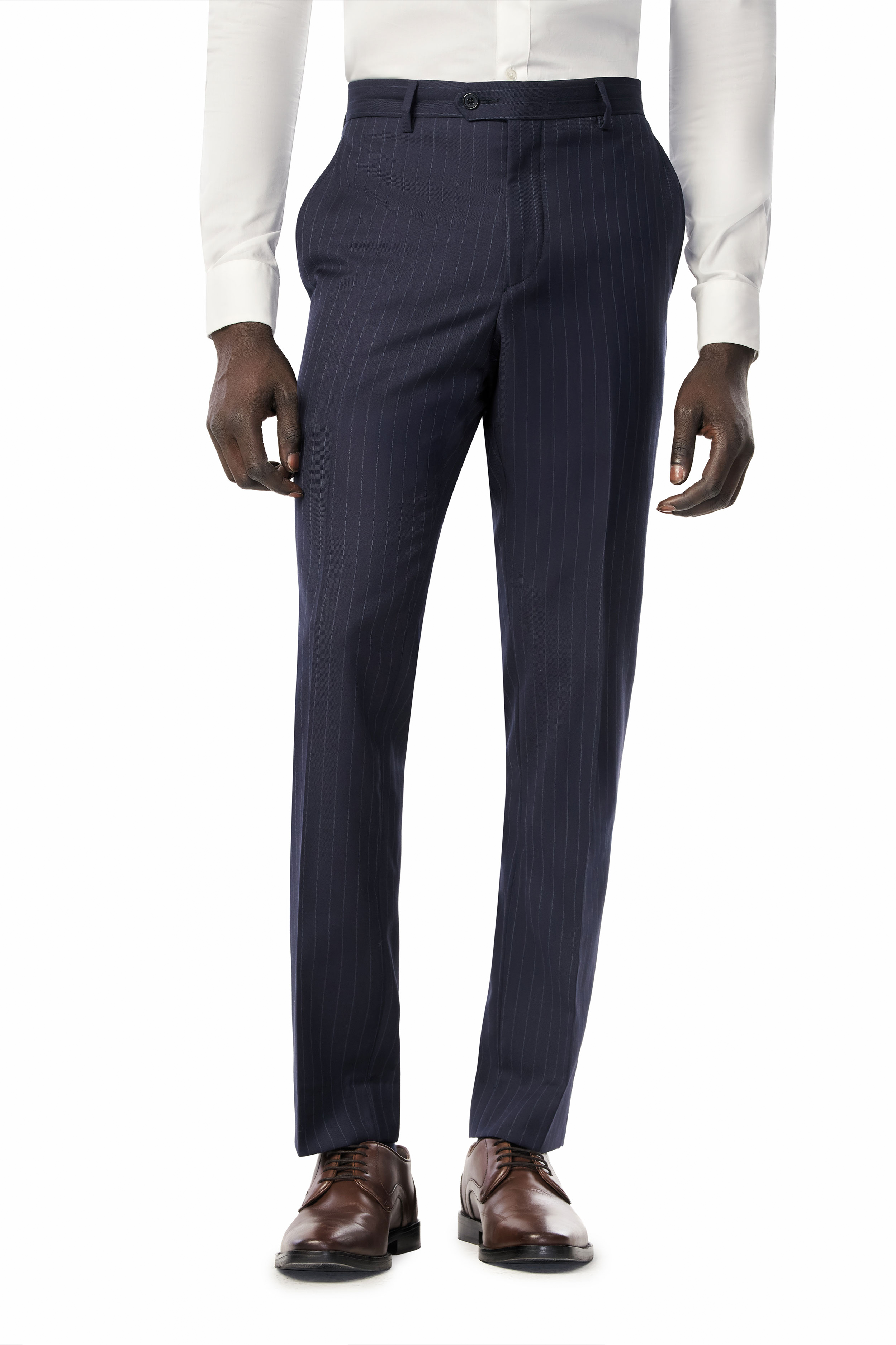 With its elegant navy pinstripe design, 100% Italian wool construction, 1/2 canvas lining, and impeccable Italian craftsmanship, this 2-button suit from The Heritage Collection is a symbol of enduring style and sophistication. The two-button jacket, notch lapel, and slim fit create a polished silhouette that commands attention. For the modern gentleman ready to elevate his presence, this Classic Navy Pinstripe suit is the ultimate expression of refined elegance.