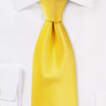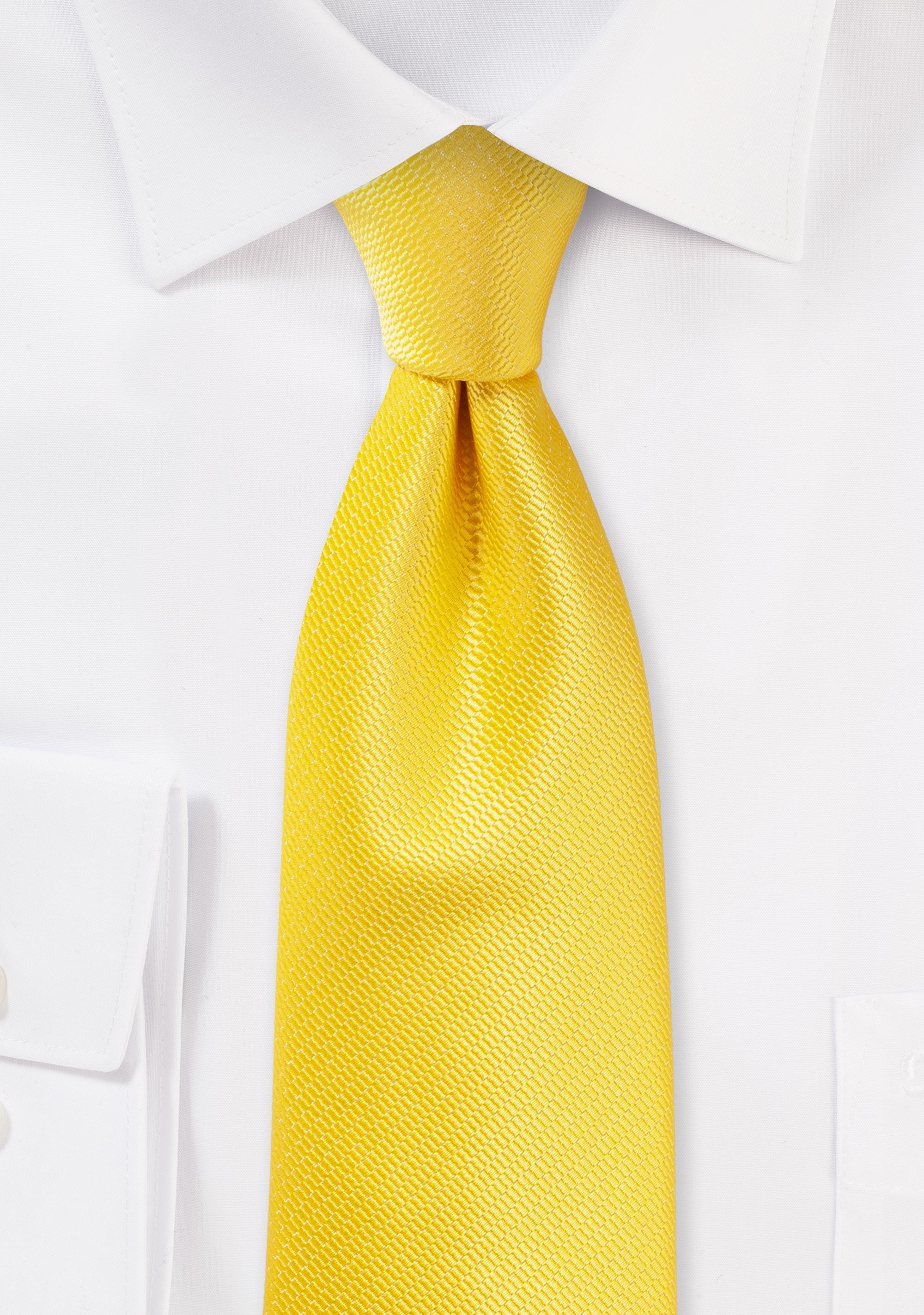 The Daffodil Small Texture Necktie is a great option for anyone looking to add a pop of bright and cheerful color to their outfit. The yellow color is bold and eye-catching, making it a great choice for spring and summer events. When shopping for suits, this tie would pair well with a navy or grey suit. The navy will provide a classic and sophisticated backdrop for the tie, while the grey will complement the yellow color nicely and create a fresh and modern look. If you're shopping for tuxedos, the Daffodil Small Texture Necktie could be paired with a black tuxedo for a pop of color that adds a fun and unique twist to a formal outfit. For men's suits for a wedding, this tie could be paired with a light grey suit to create a cheerful and bright look. Alternatively, you could pair the tie with a navy suit to create a bold and eye-catching contrast.