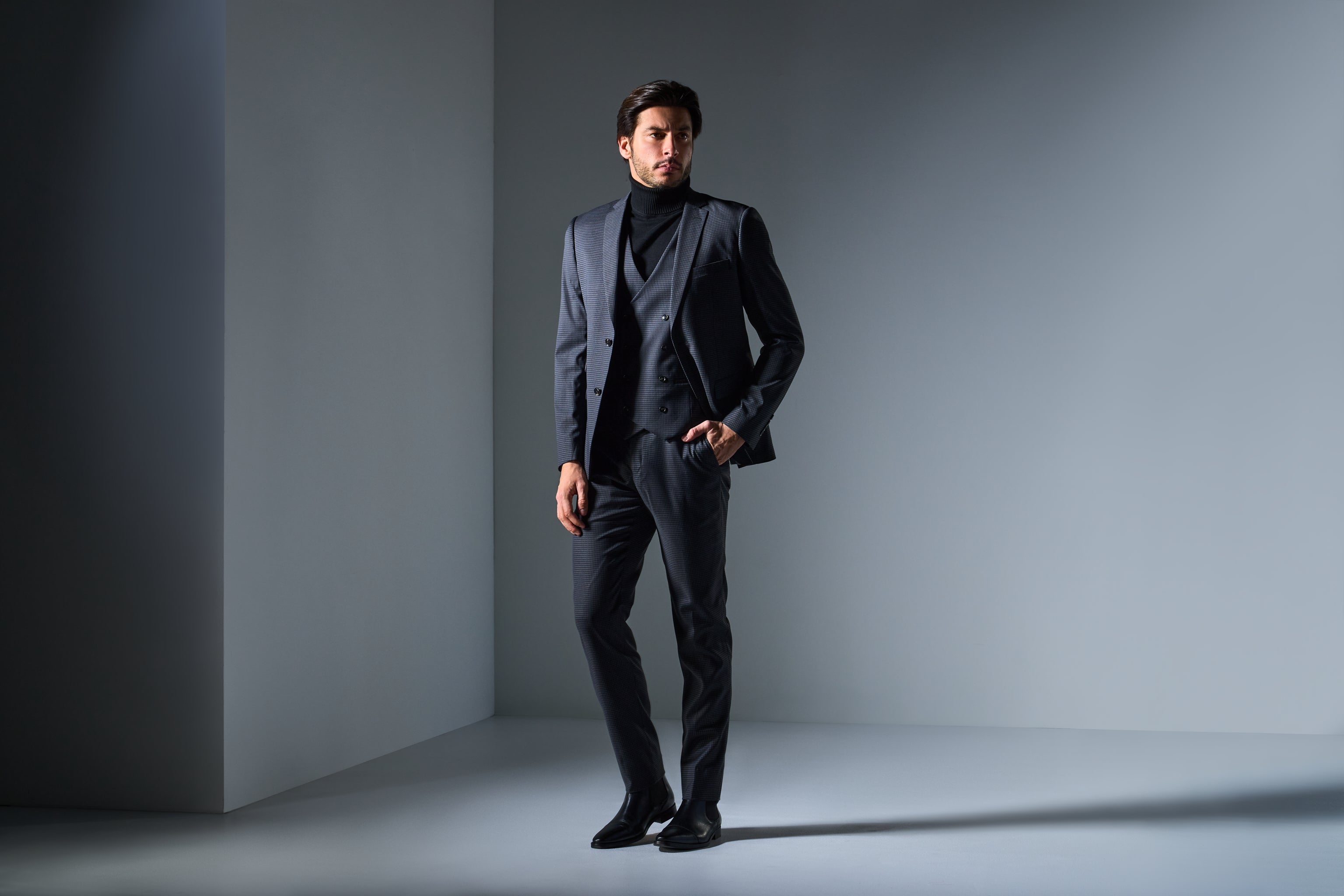 The jacket, with its sleek two-button closure and notched lapels, offers a contemporary fit that accentuates the masculine silhouette. The vest, featuring a modern double breast design, provides an additional layer of sophistication. In addition, the trousers, with their flat-front style, ensure a clean and modern line. The flat pants also come with unfinished hems so that you can customize them to your length.
