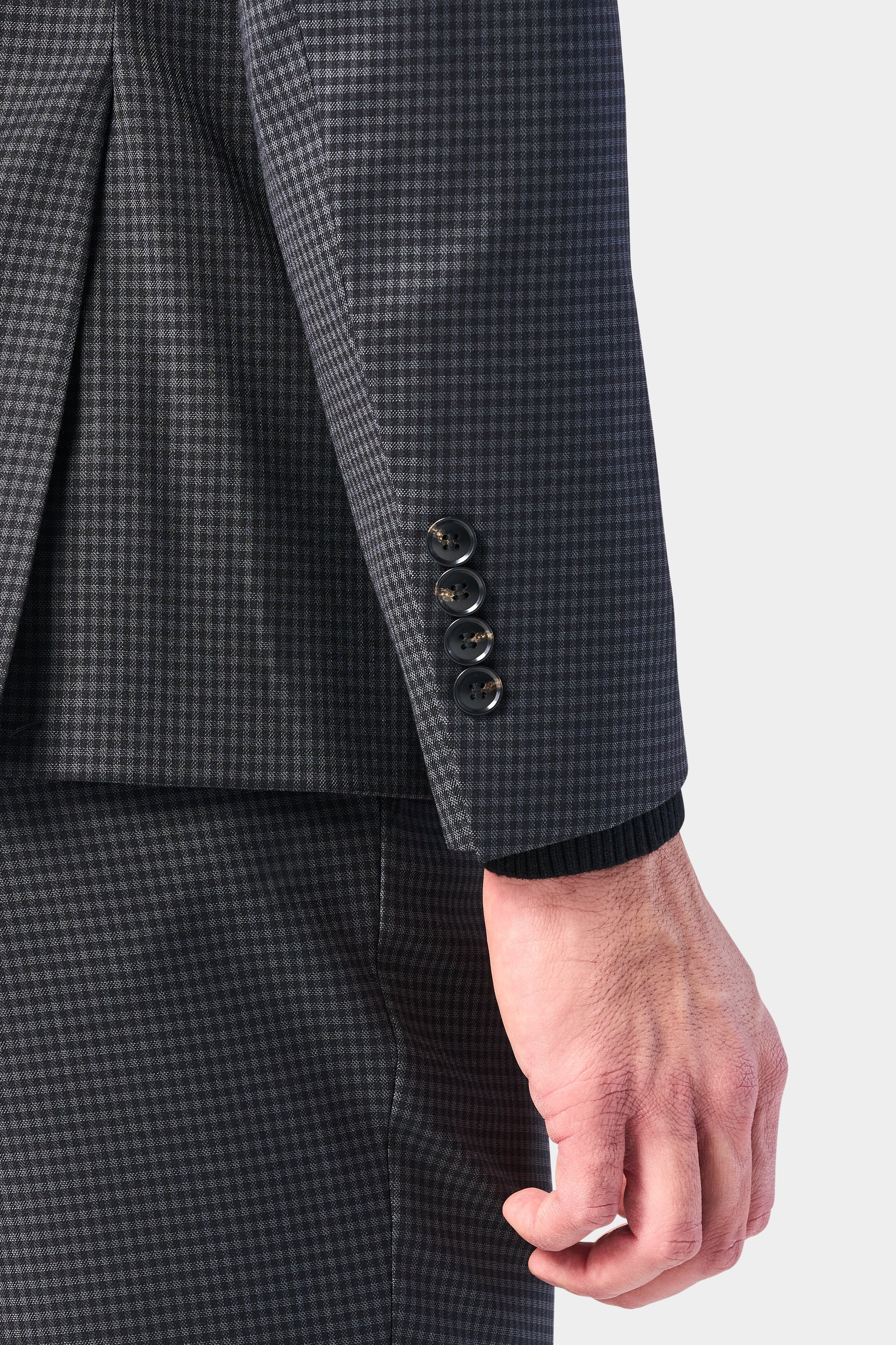 The fabric of the suit speaks volumes about its quality and sophistication, featuring a mini-check pattern that is understated yet chic. The combination of gray and black checks offers a versatile and enduring appearance, effortlessly transitioning from professional settings to social gatherings. The dynamic gray and black mini-check design radiates refined confidence, ensuring the outfit makes a stylish statement wherever you go.