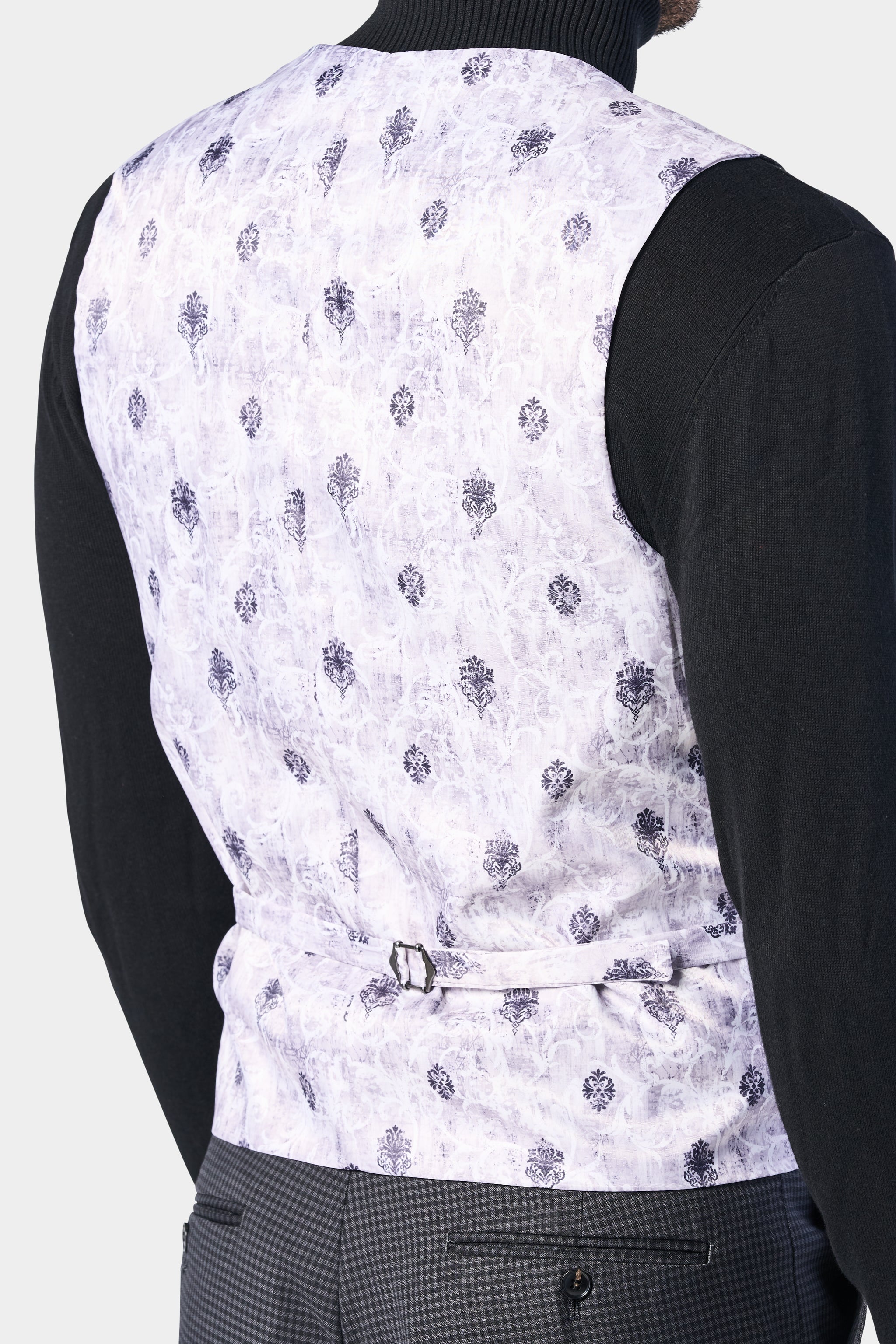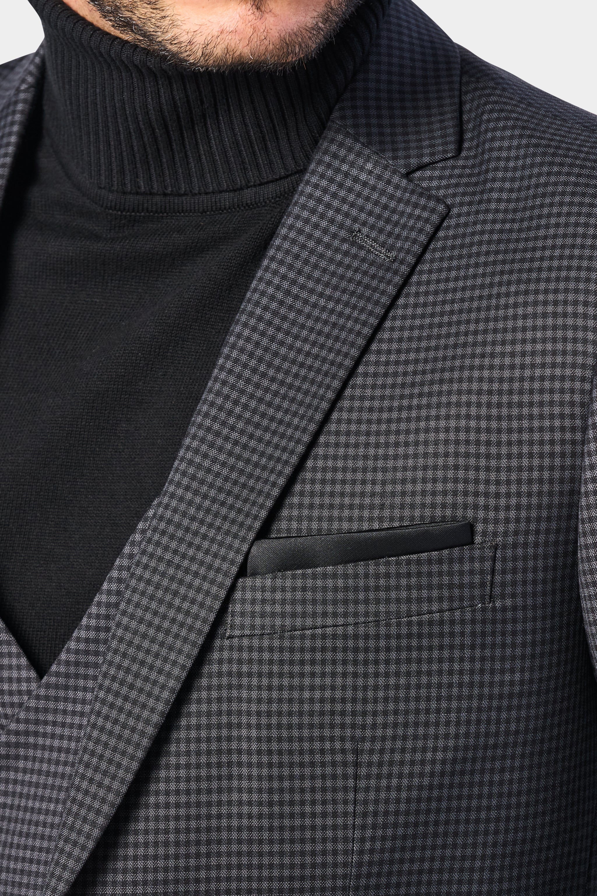 Dive into the exquisite artistry of this Gray and Black Mini Check 3-piece suit. This ensemble represents the pinnacle of sartorial craftsmanship, tailored for the contemporary gentleman who appreciates both fashion and quality in his attire. With its timeless pattern and modern silhouette, it promises to be a cherished addition to your wardrobe.