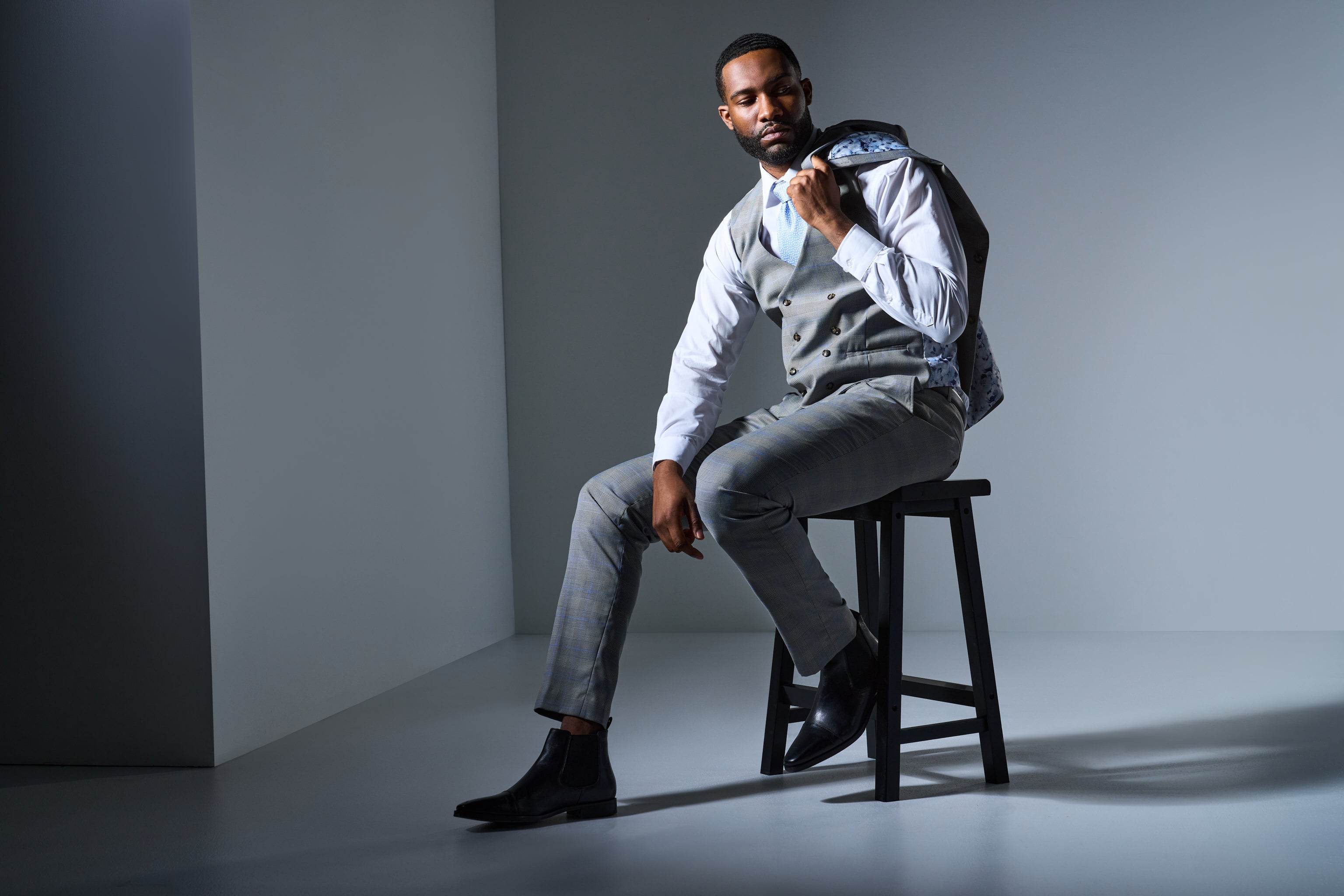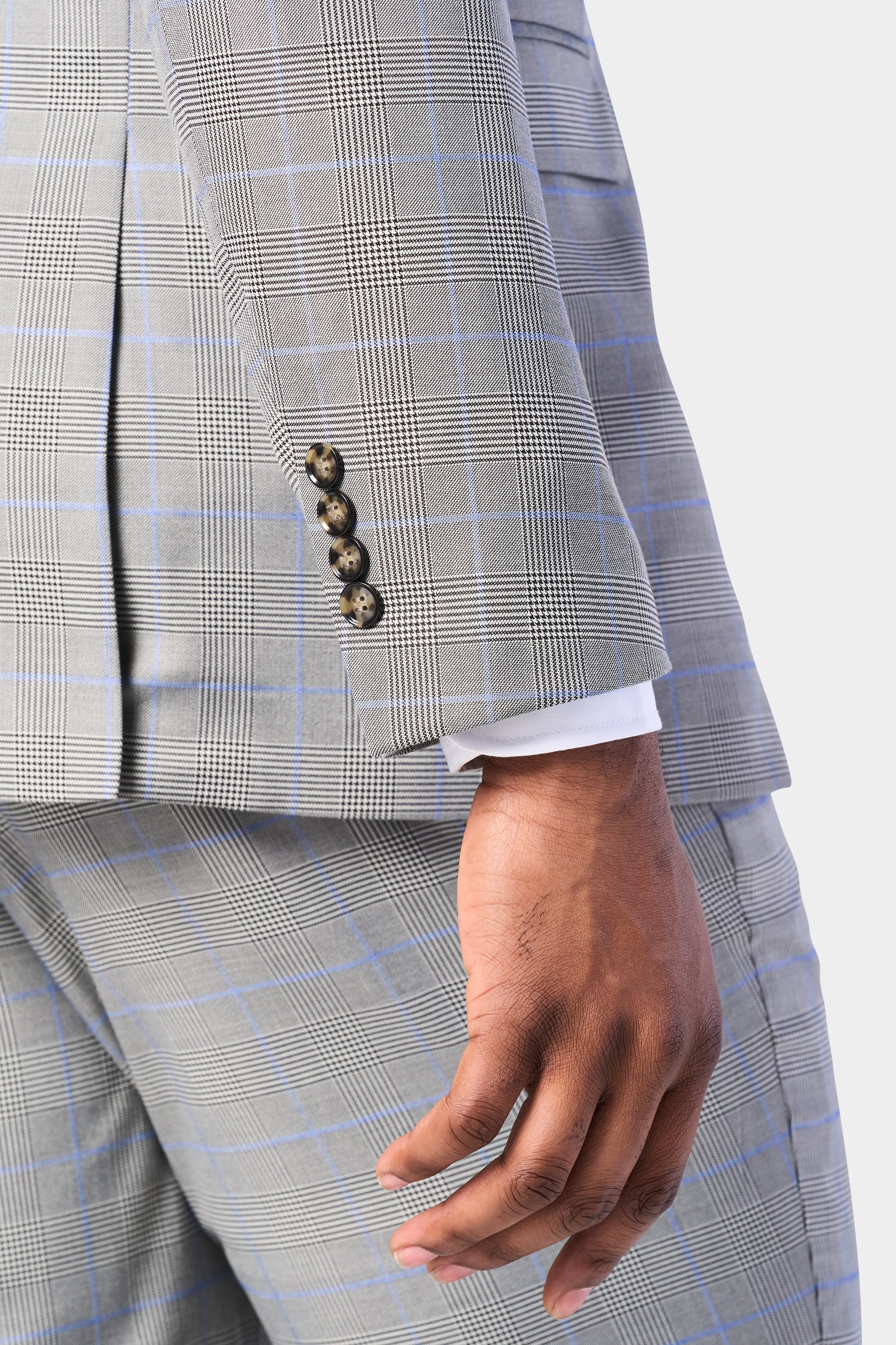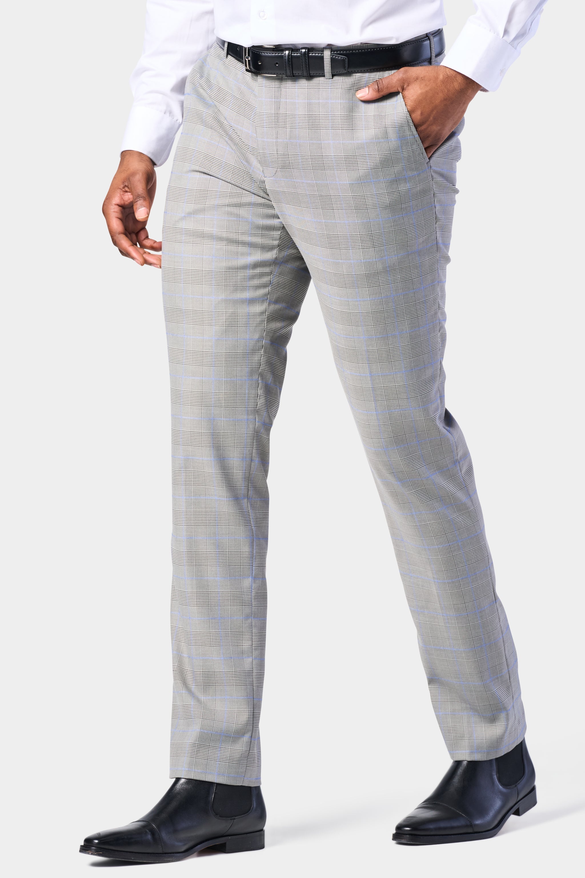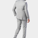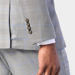 This three-piece suit is crafted from a refined poly-viscose and spandex blend, ensuring both comfort and durability. The gray and blue Glenn plaid pattern is a nod to the heritage of classic menswear. These color combinations and patterns offer a subtle yet striking visual appeal that is both versatile and sophisticated.