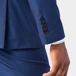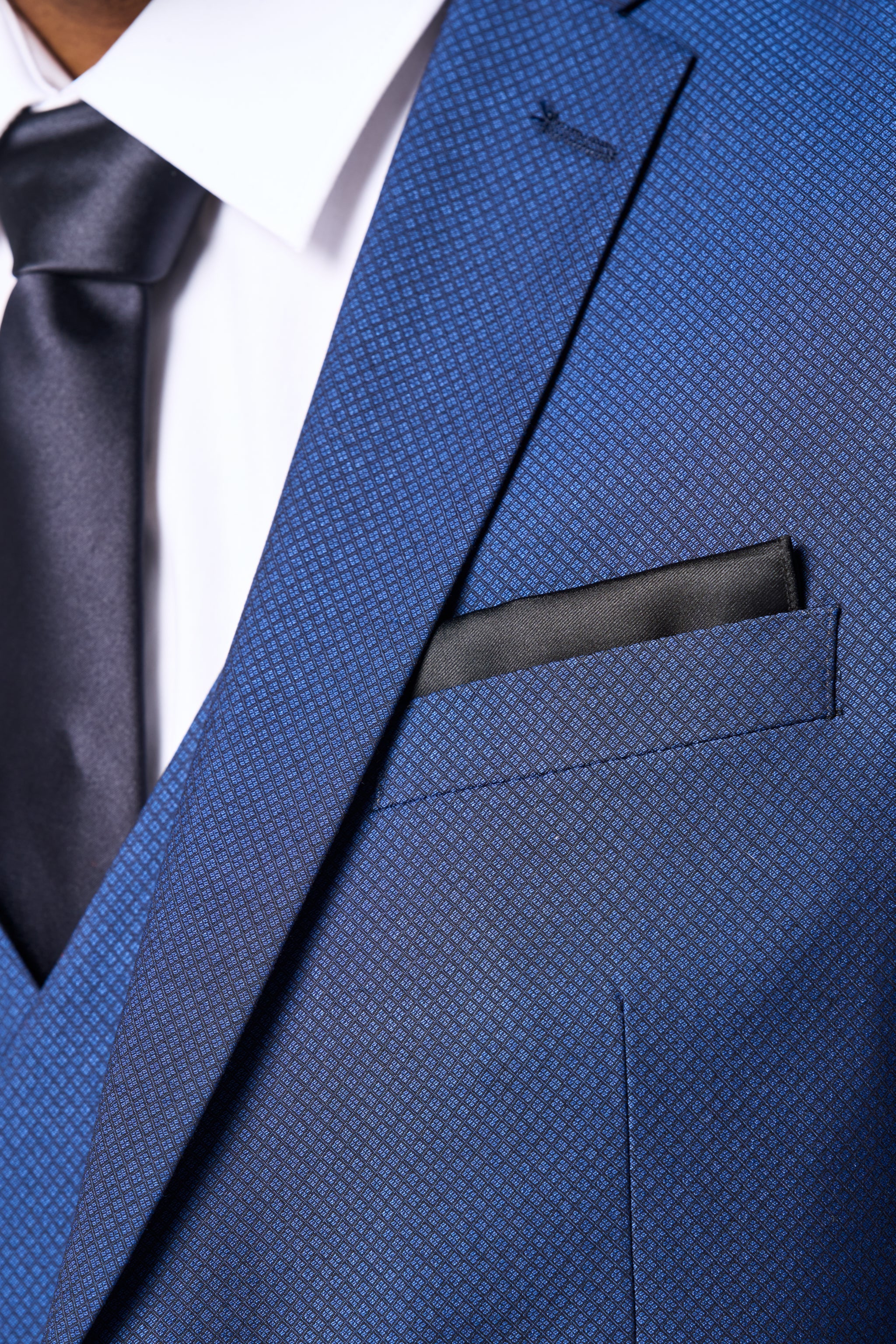 Fashioned from a lavish blend of poly-viscose and spandex, this three-piece suit showcases a distinctive diamond texture that not only captures light but also introduces a captivating visual dimension to the fabric. The medium blue shade is versatile and flattering, rendering it an exceptional selection for a multitude of occasions.