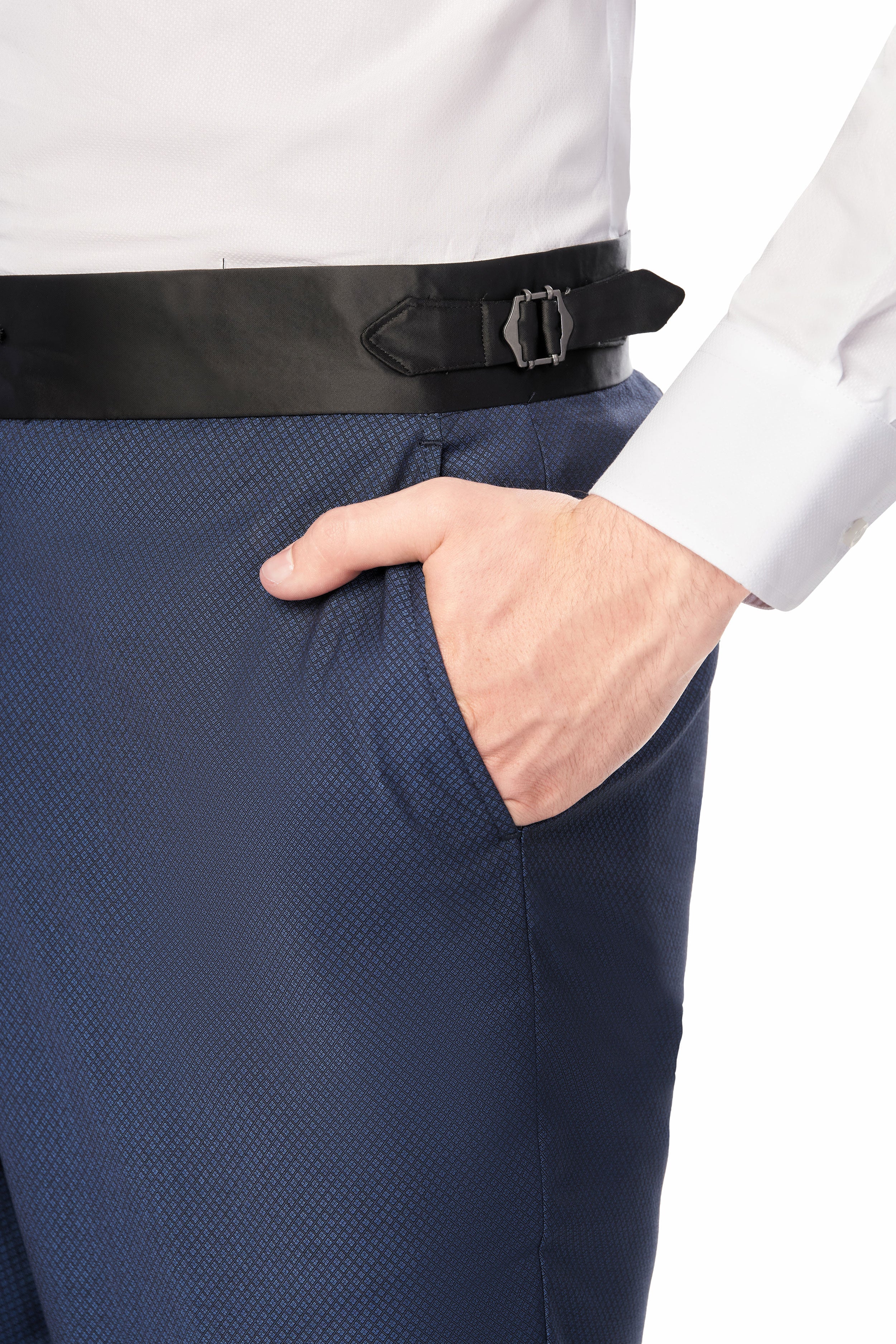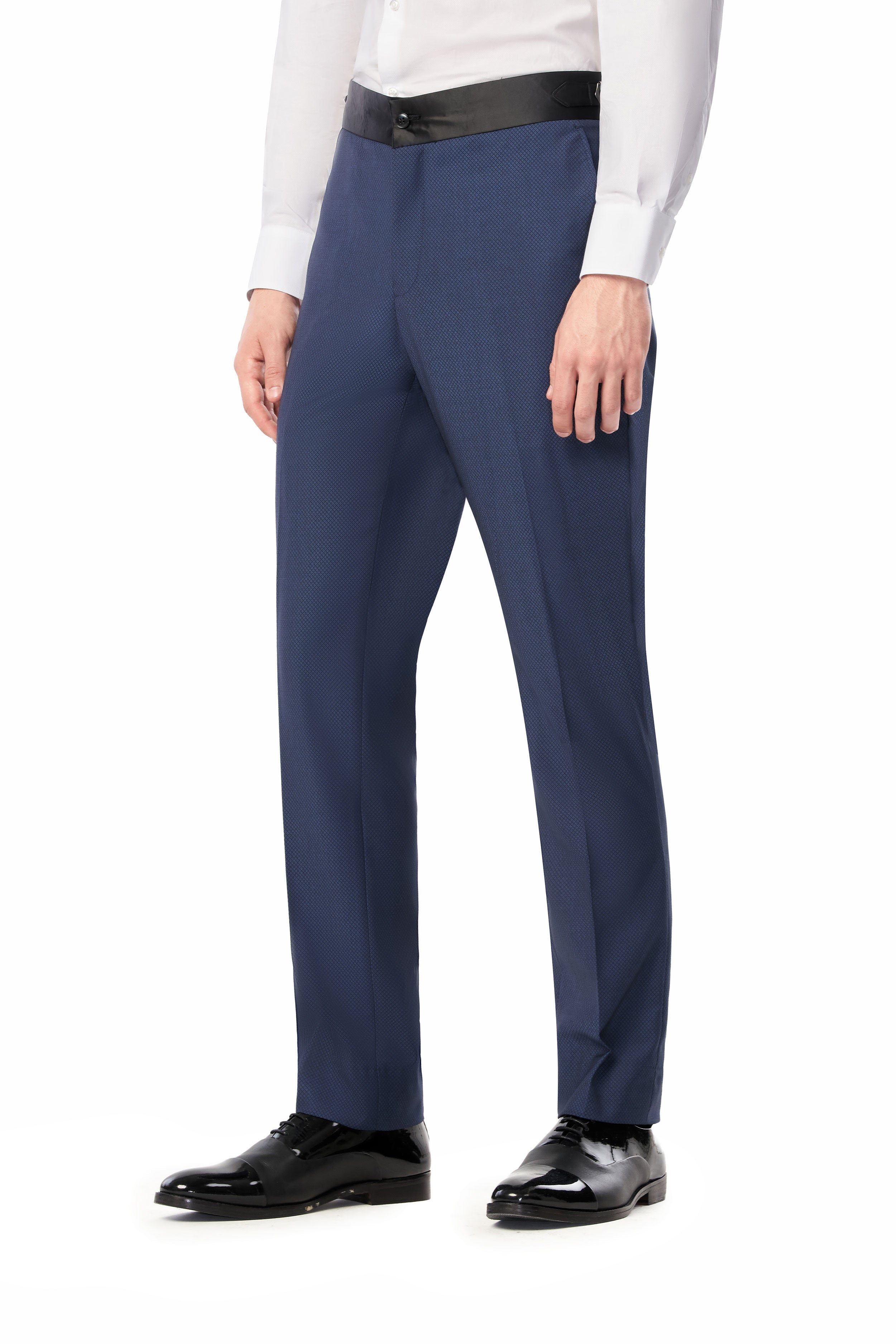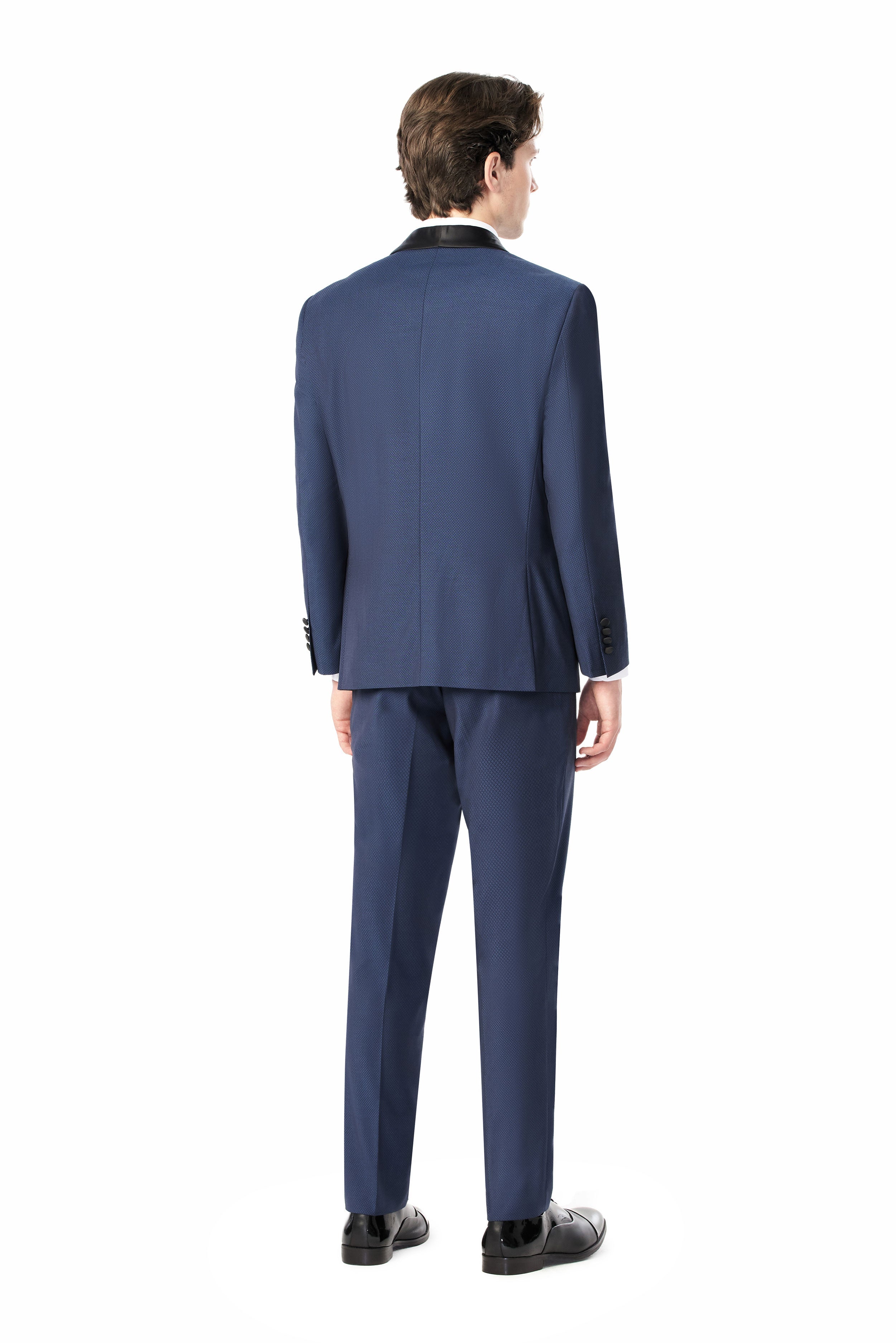 Woven from a premium wool blend, the tuxedo boasts a distinctive diamond texture that adds more dimension to the medium blue fabric. This subtle yet striking pattern plays with light and shadow. Thereby, offering a visual feast that is both understated and captivating. Also, the remarkable blue diamond shade evokes a sense of depth and sophistication. This color is versatile enough to enhance the suit's overall appeal and complement different occasions and pairings.