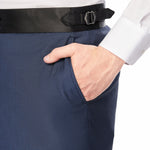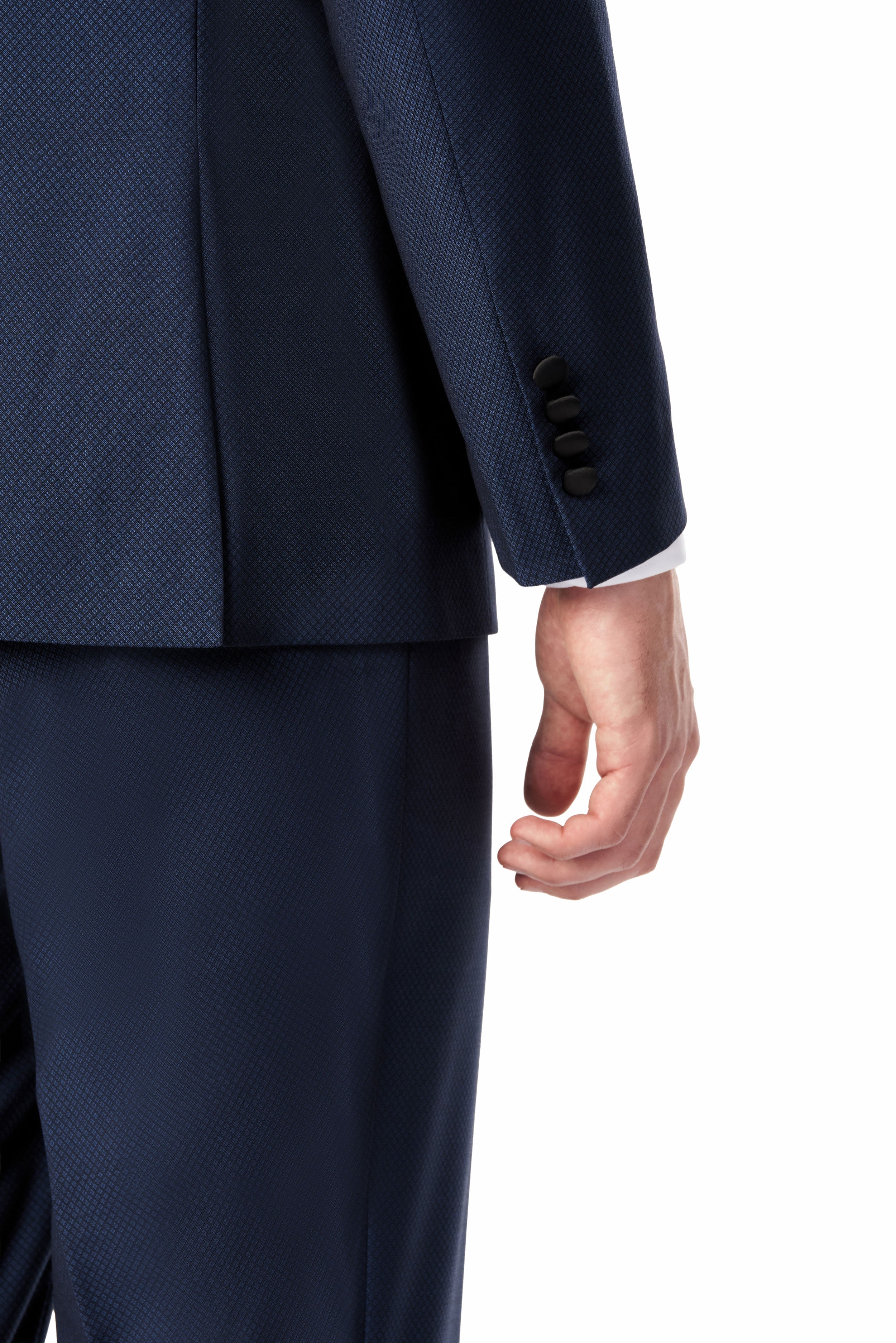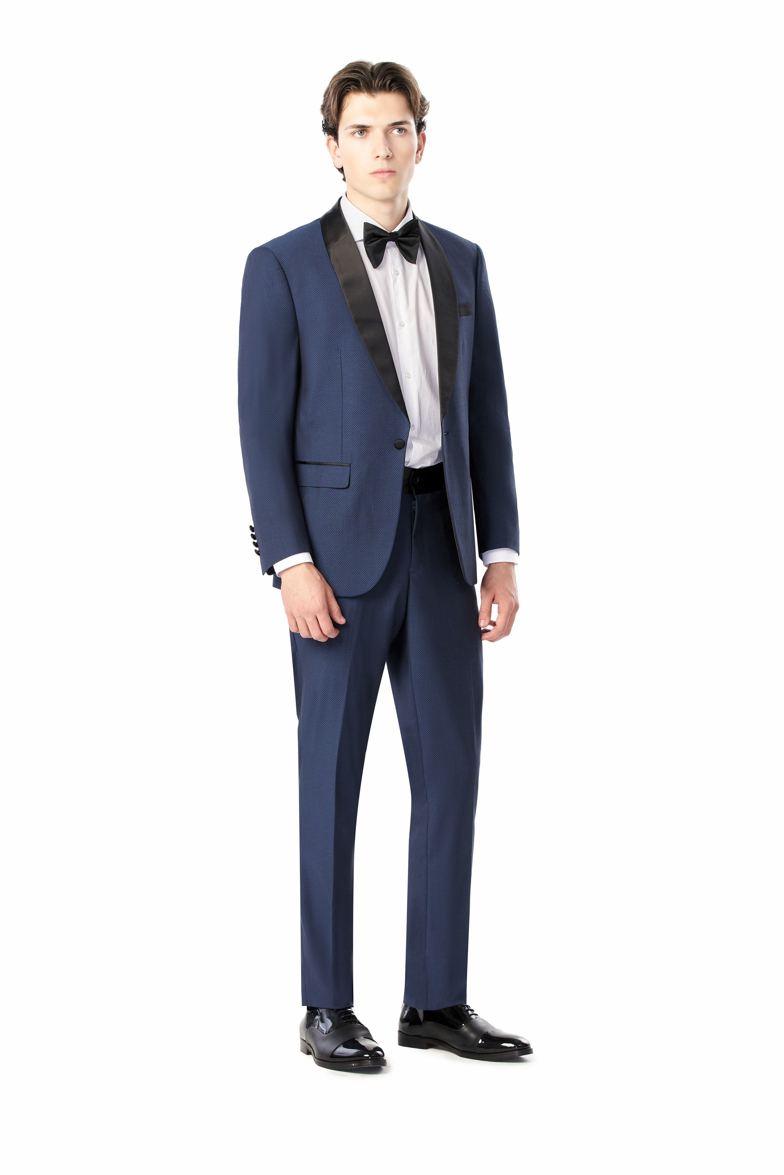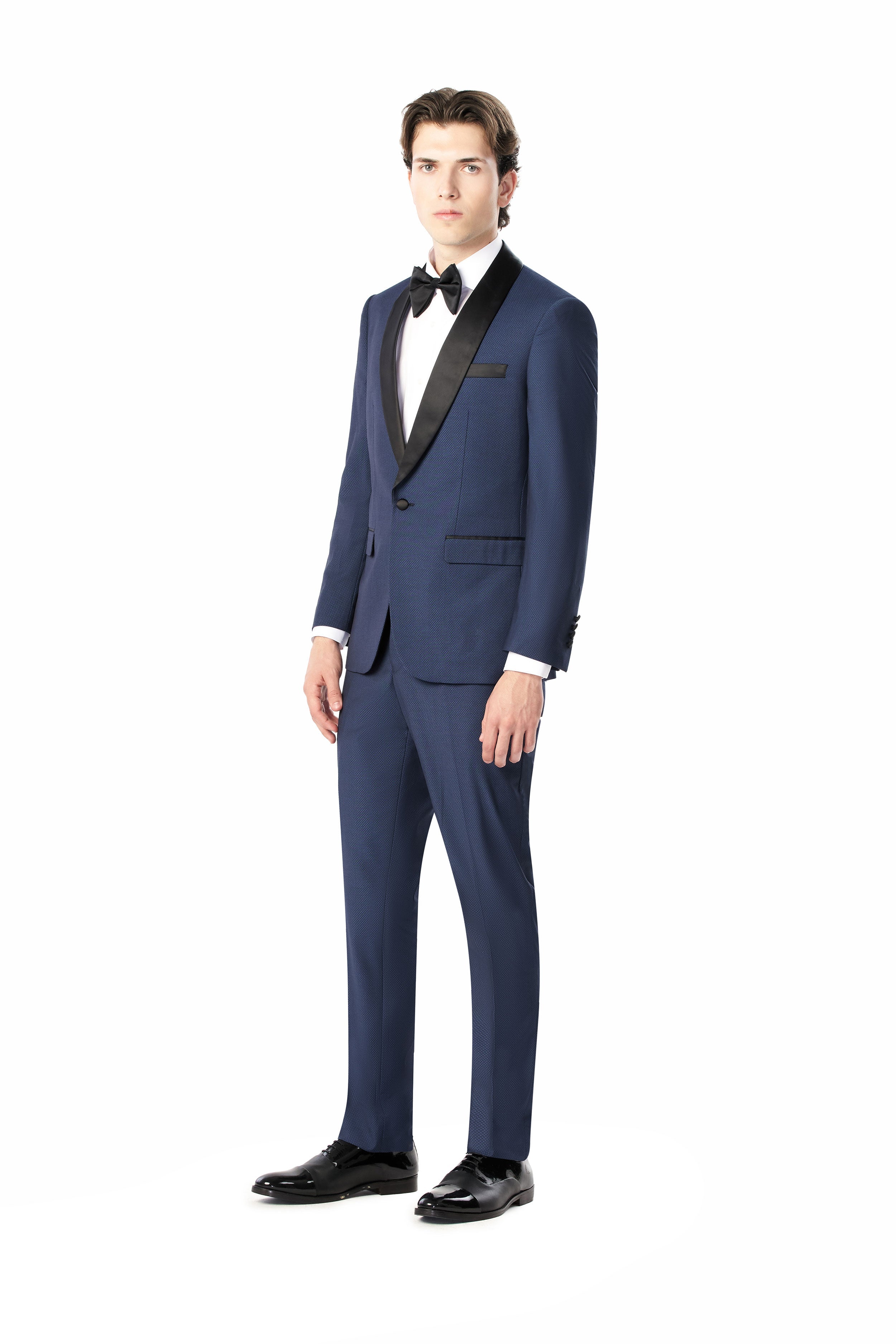 Woven from a premium wool blend, the tuxedo boasts a distinctive diamond texture that adds more dimension to the medium blue fabric. This subtle yet striking pattern plays with light and shadow. Thereby, offering a visual feast that is both understated and captivating. Also, the remarkable blue diamond shade evokes a sense of depth and sophistication. This color is versatile enough to enhance the suit's overall appeal and complement different occasions and pairings.