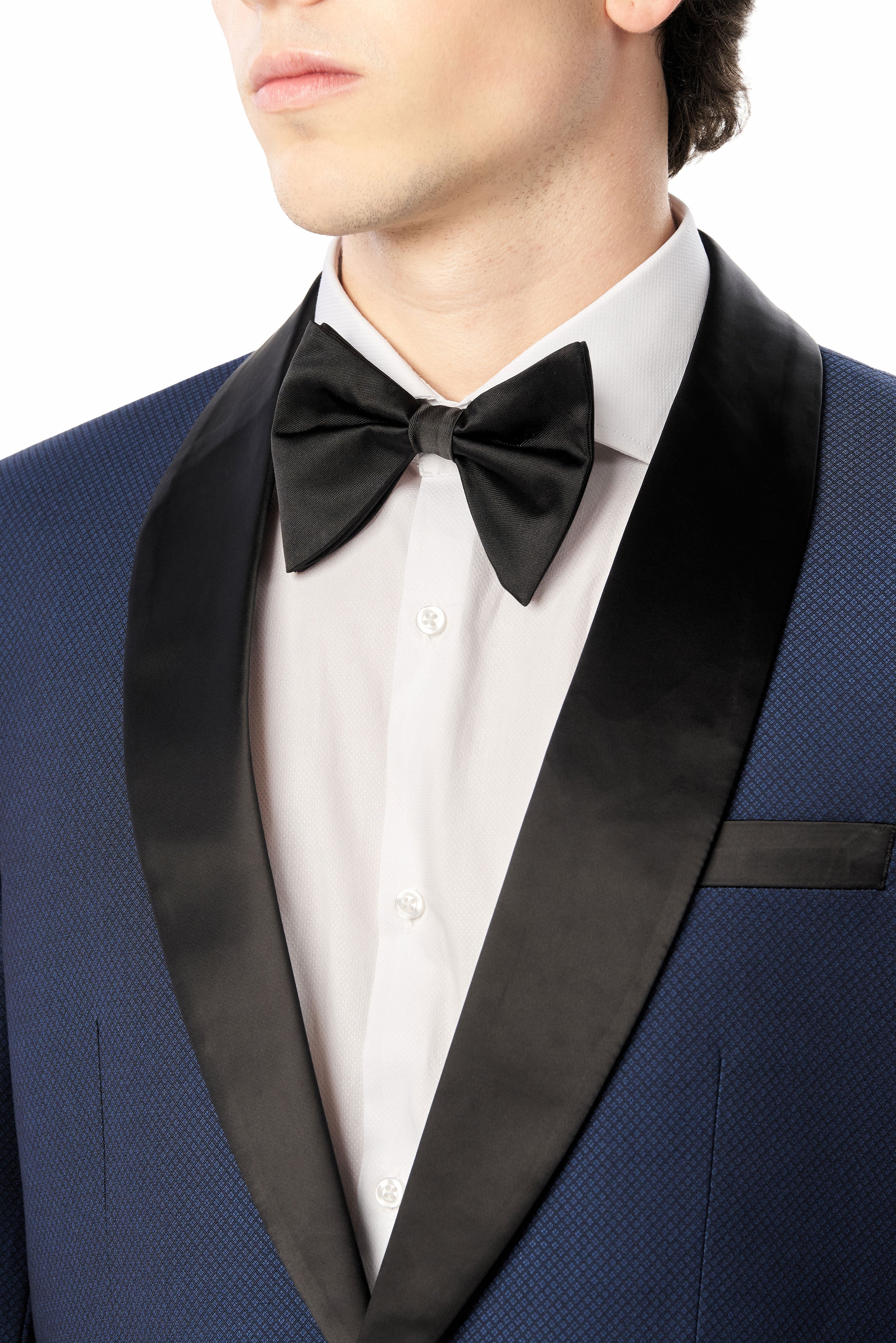 Furthermore, this Medium Blue Diamond Texture Shawl Lapel Tuxedo pairs beautifully with a crisp white dress shirt and a bow tie for a timeless black-tie look. For a more contemporary twist, consider a black silk shirt and patent leather loafers. The shawl lapel also makes it an ideal choice for pairing with statement accessories, such as a pocket square or cufflinks.