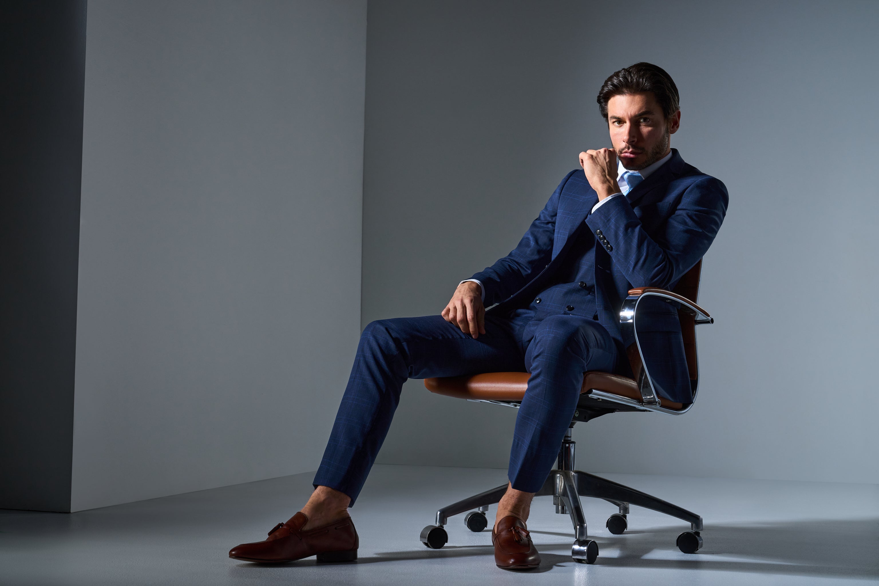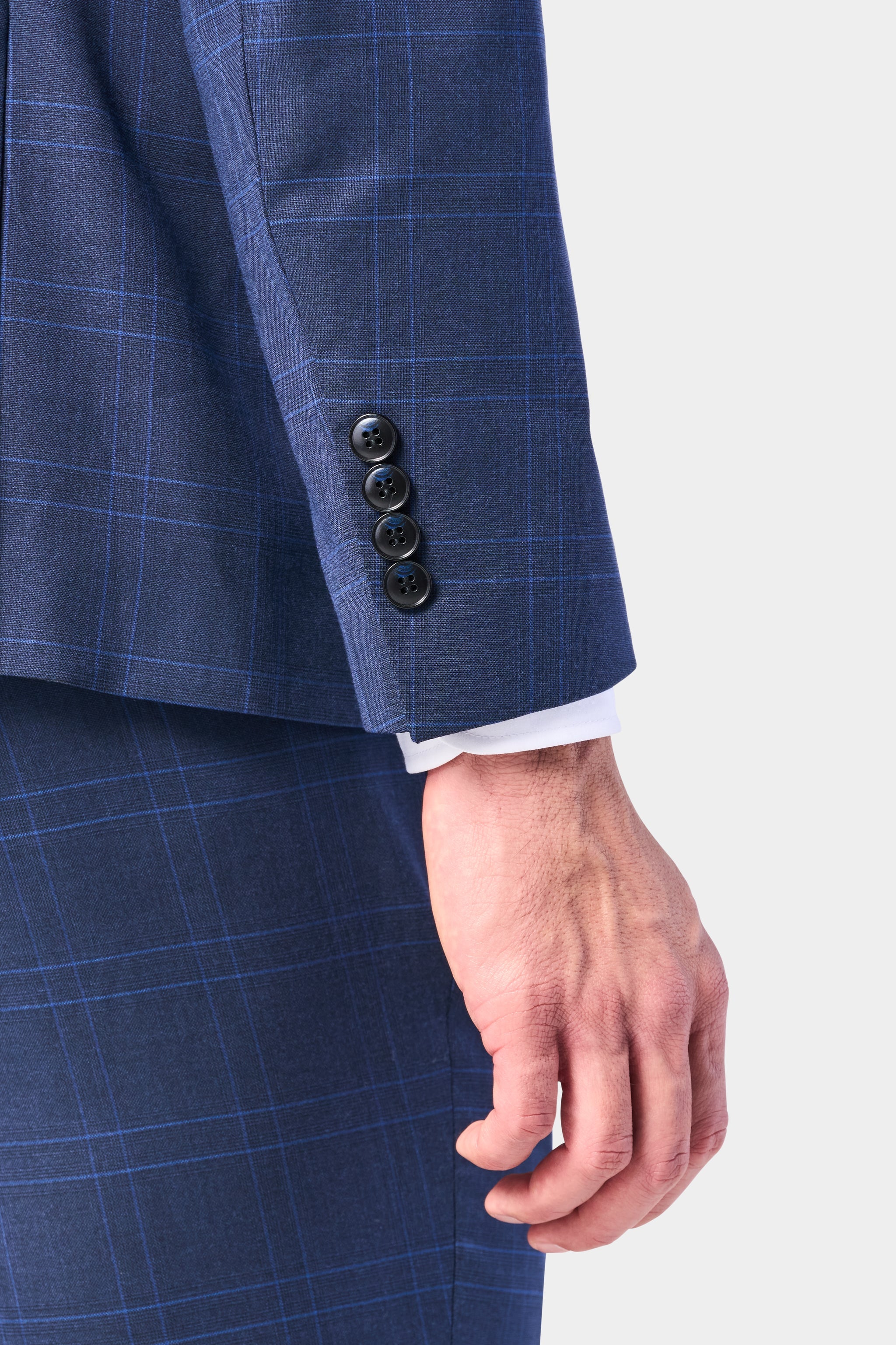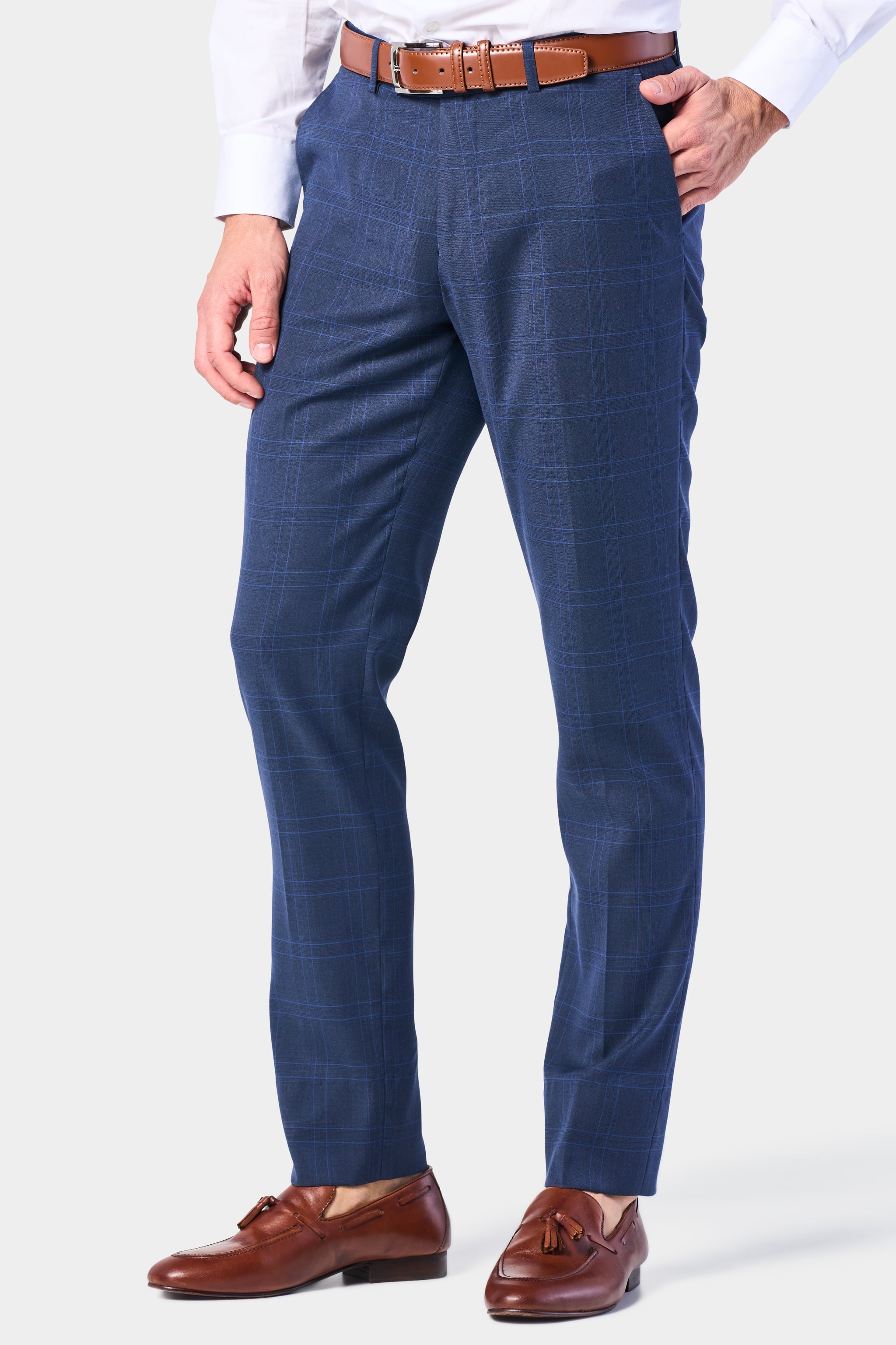Fashioned from a luxurious blend of poly-viscose and spandex, this three-piece suit features a medium blue plaid pattern that emanates sophistication and refinement. The subtle interplay of blue hues and the intricate plaid design produce a visual motif that is both captivating and tasteful. This renders the suit the perfect ensemble for individuals who value sartorial elegance and strive to appear stylish on all occasions.