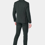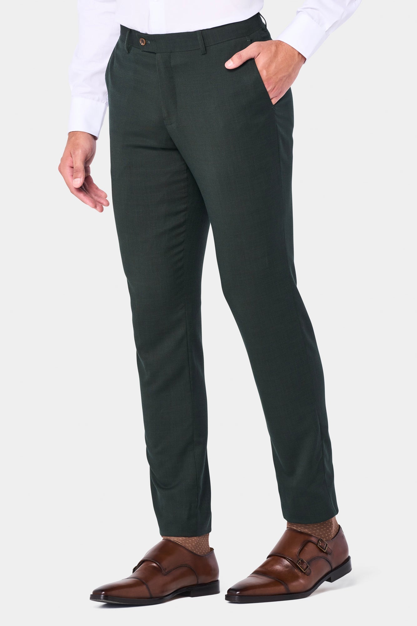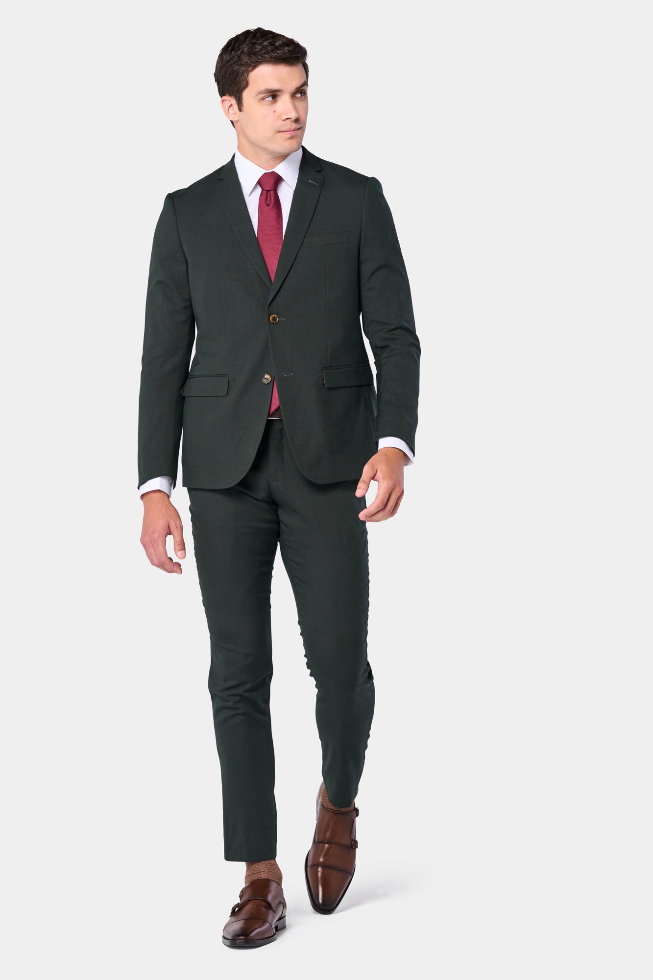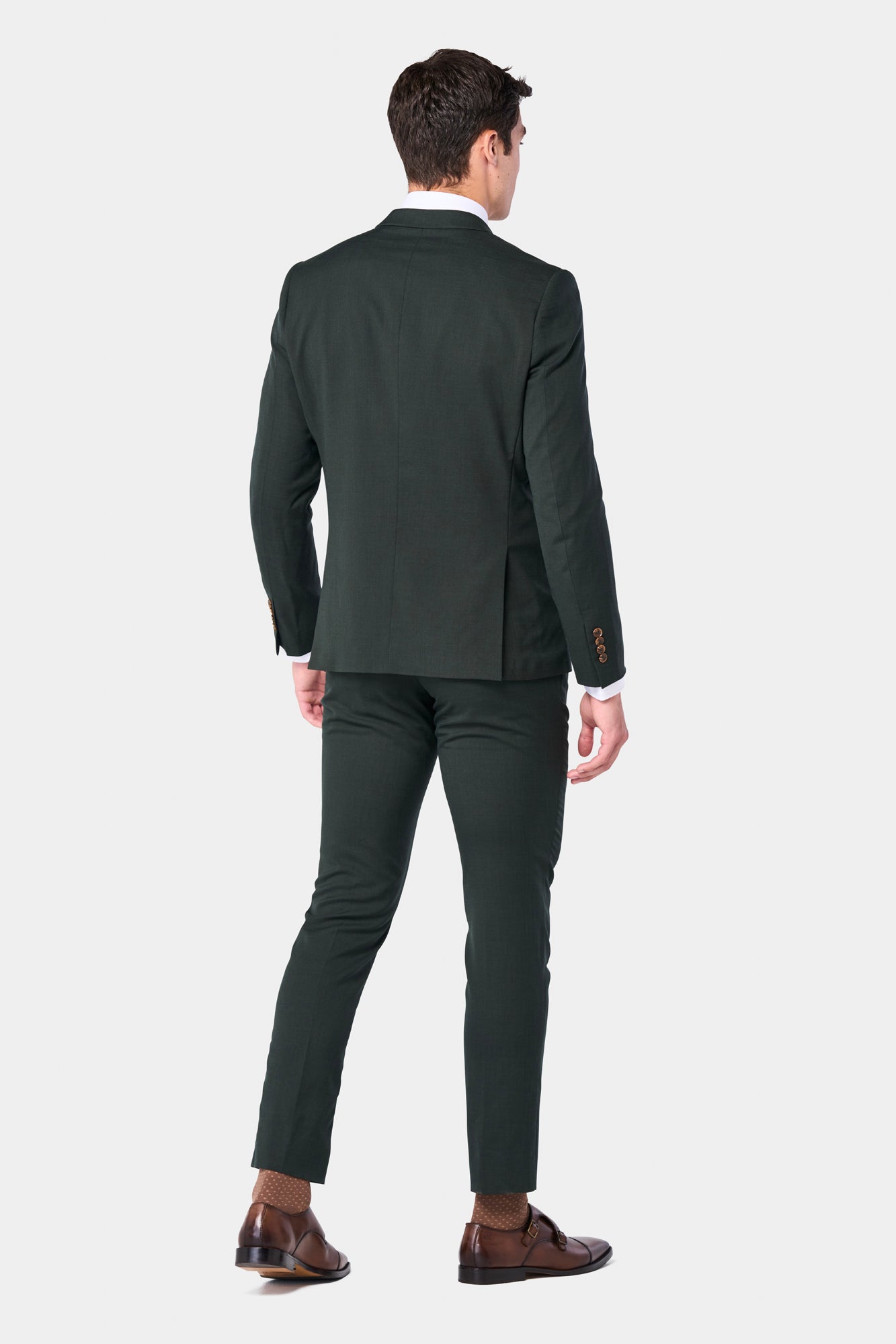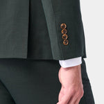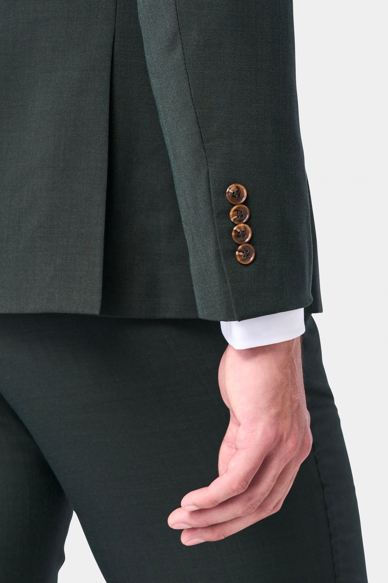 This suit has a woven sharkskin pattern in a deep olive color that adds a touch of sophistication and style to your look. Also, the tailored jacket features structured shoulder padding to maintain its shape and dual side vents at the back, allowing flexibility. It also has a versatile two-button front, which provides a clean, timeless aesthetic. The matching flat-front pants sit perfectly at the hips with an unfinished hem, ready for custom tailoring.