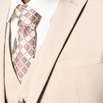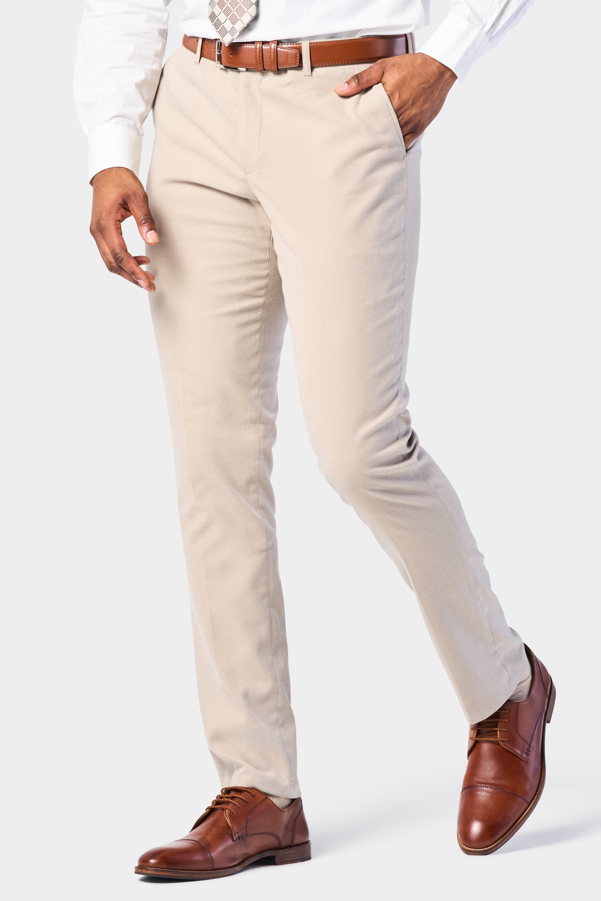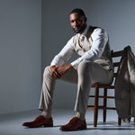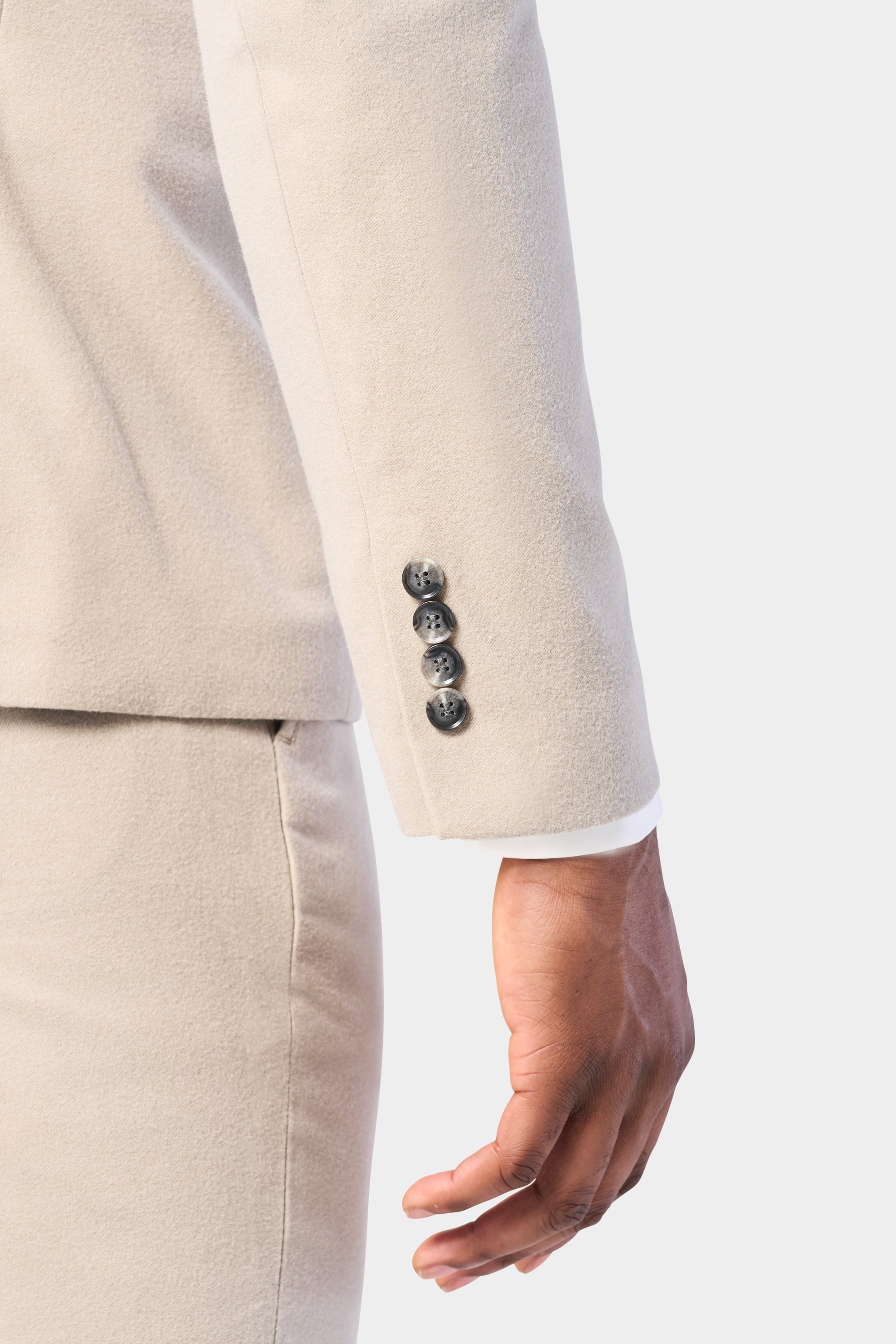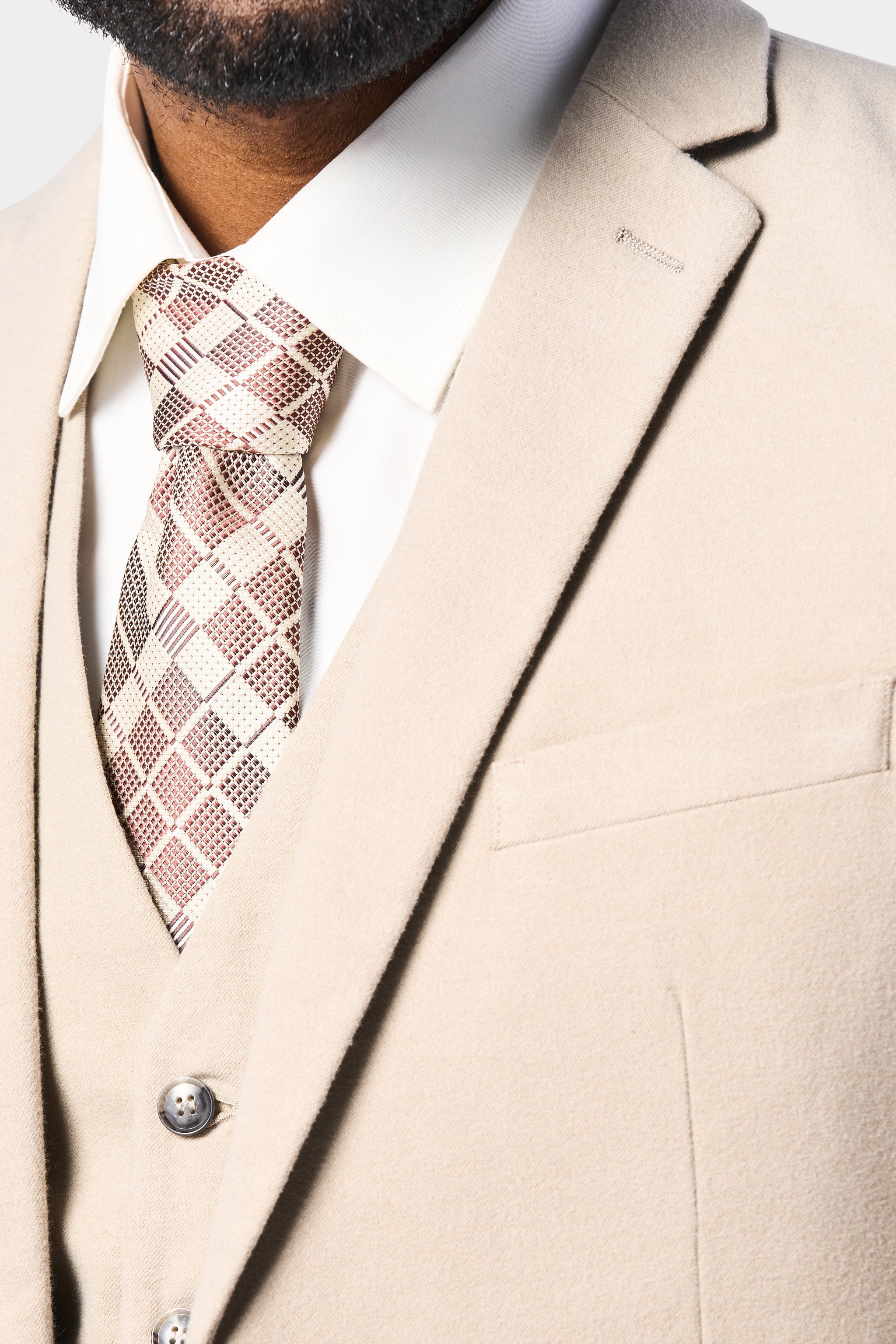 The suit's flannel fabric, a blend of durability and softness, comes in a versatile tan shade that complements a variety of shirts and ties. The subtle texture of the flannel adds depth to the suit's appearance, making it a standout piece in both texture and color. Also, the tan color of the suit is versatile and elegant, and can seamlessly fit any shirt, tie, and shoes.