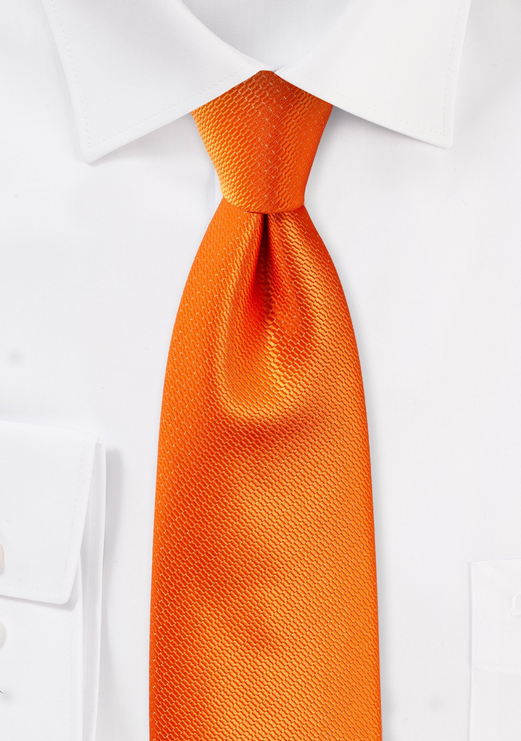 The Tangerine Orange Small Texture Necktie can be a bold and unique accessory that adds a pop of color and personality to a variety of outfits. Here are some suggestions on how to wear it: Shopping for suits: The Tangerine Orange Small Texture Necktie can be paired with a navy or charcoal suit for a stylish and modern look. Choose a white or light blue dress shirt and brown leather dress shoes to complement the tie. Tuxedos: For a daring and bold outfit, the Tangerine Orange Small Texture Necktie can be worn with a black or midnight blue tuxedo. Pair it with a white dress shirt and black dress shoes for a formal yet trendy look. Men's suits for a wedding: The Tangerine Orange Small Texture Necktie can add a pop of color to a light grey or beige suit, making it a great choice for a summer or fall wedding. Pair it with a white or light blue dress shirt and brown leather dress shoes for a fashionable and memorable look. Remember, when wearing a bold accessory like the Tangerine Orange Small Texture Necktie, it's important to balance it with more subdued pieces to avoid overwhelming your outfit. Keep the rest of your ensemble relatively simple and classic to let the tie shine.